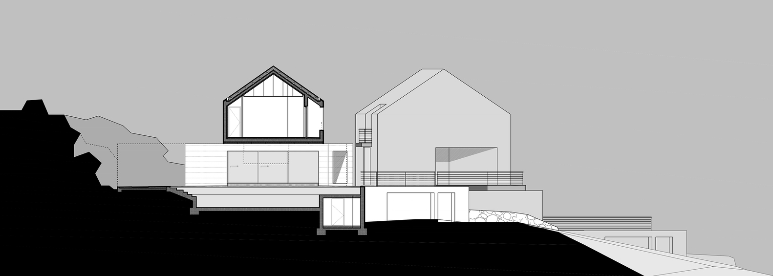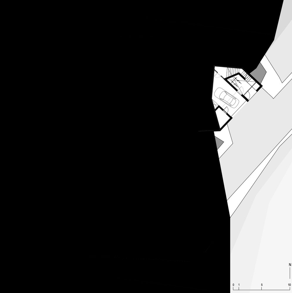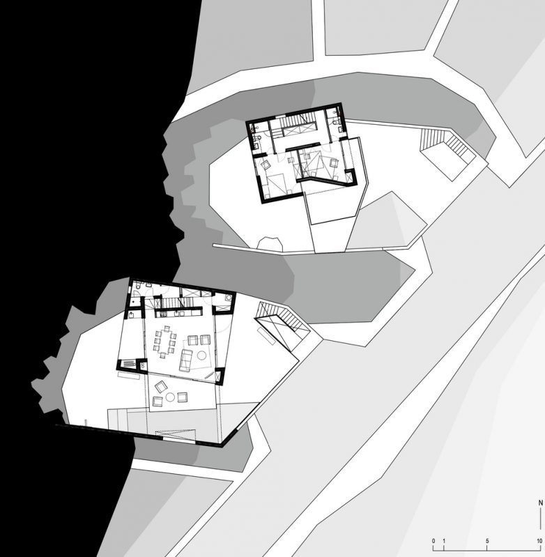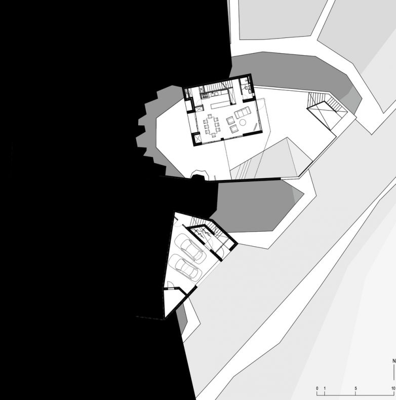 Položaj kuće na platformi definiše južno dvorište omeđeno brazdama sa iskopanog terena, uokvireni natkriveni prolaz i severna terasa sa pogledom na more.