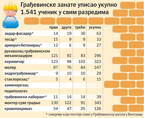 Nekada poznata srednja građevinska škola u Crnoj Travi koja je izvodila na put cenjene majstore širom sveta davno je zatvorila svoja vrata. Po svemu sudeći problem nije samo u maloj sredini jer i Građevinaska škola u glavnom gradu ove godine školuje svega 11 zidara, 15 tesara i 12 armirača-betonirac. Najveće interesovanje je na smeru rukovodilac građevinskom mehanizacijom (121), keramičar (123) i monter suve gradnje (130). Broj učenika koji žele da bave građevinskim zanatom sve je manji pa Srbiji preti uvoz radne snage i to najverovatnije iz Kine.