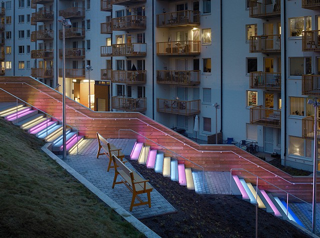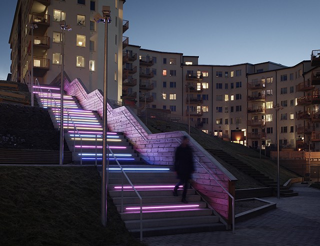 Svetlosna instalacija intergrisana je u betonsko stepenište visine 13 metara čime je napravljen savršen sklad s krajolikom novog stambenog dela švedske prestonice. Instalacija, koja podeća na razmotan svetlosni tepih, vidi se jasno i s druge strane zaliva Arsta.