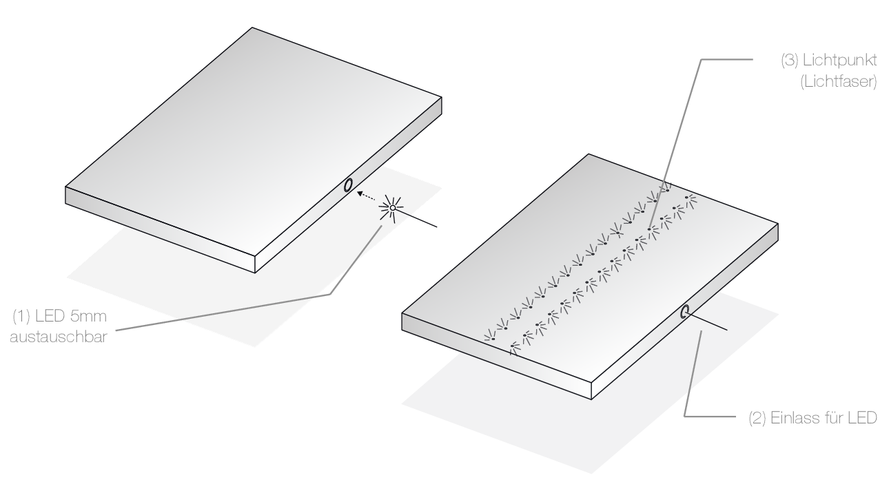Unutar, skoro potpuno neporozne, prefabrikane betonske ploče položena su optička vlakna koja se završavaju na predefinisanim mestima. Izvor svetlosti su klasične LED svetiljke postavljene sa bočnim ivicima ploče. Integrisana optička vlakna preuzimaju LED svetlo i prenose ga direktno na betonsku površinu što daje lep vizuelni efekat.