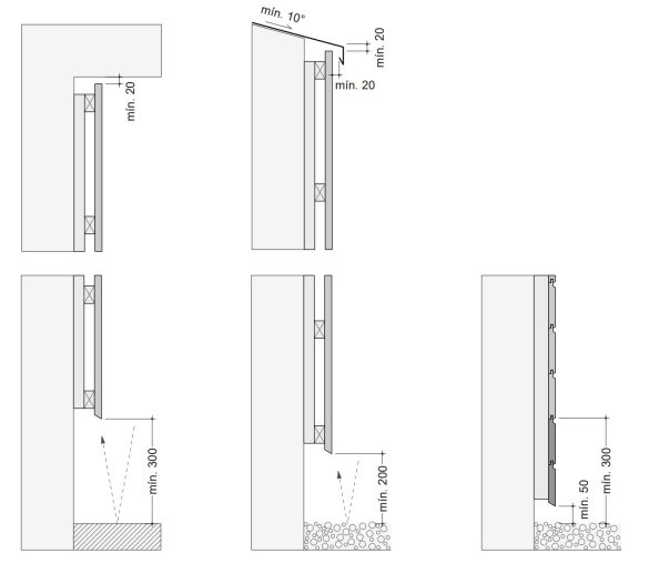Preporučljivo je ostaviti slobodan otvor širine najmanje 2 cm između profila obloge i nadstrešnice, krova ili bilo kakvo opšivanja ili završne obrade. Ovaj razmak omogućava ventilaciju šupljine.