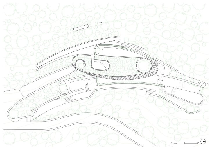 Kuća se proteže duž planinskog pejzaža prekrivenog divljim rastinjem i maslinama, a zamišljena je kao primorsko utočište eliptične siluete koja definiše zajedničke prostore, dok su spavaće sobe integrisane u topografiju na gornjem spratu.