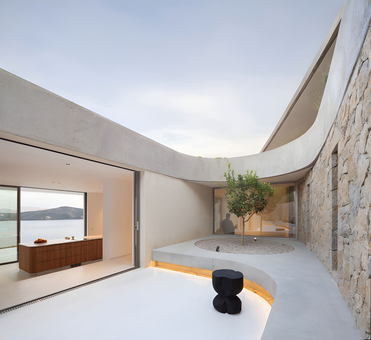 Kako su objasnili iz studija sa kancelarijama u Londonu, Briselu i Grčkoj, eliptični dnevni boravak odvaja se od padine, formirajući izolovani dvorišni vrt koji pruža hlad i naglašava pogled na planinu i nebo.