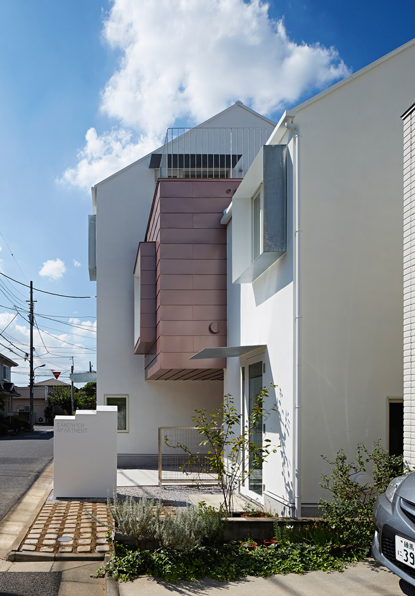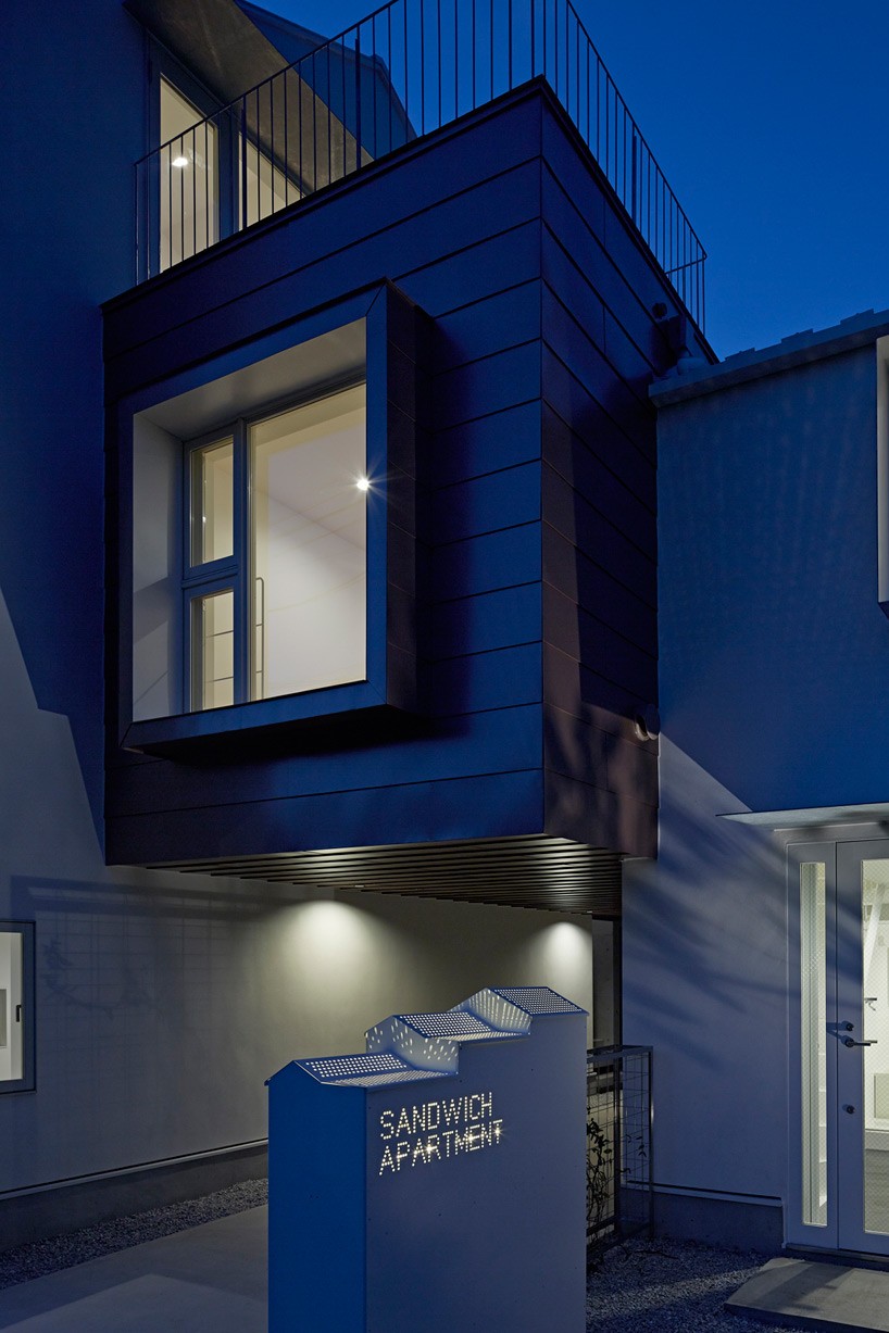 Srednji stan, u kom živi vlasnik, proteže se preko drugog nivoa susedna dva stana. S obe strane oslanja se na njih poput sendviča, stvarajući čistinu u prizemnoj zoni. Ovaj otvoreni prostor predviđen je za okupljanje stanara i komšiluka.