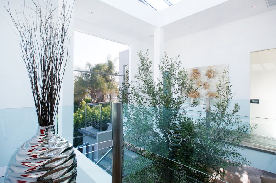 Viđali smo dosta primera kuća koje u enterijeru imaju zasađeno drvo ali se do sada nismo susreli s ovakvo neobičnim rešenjem. Saksija s drvetom teška oko 950 kilograma okačena je čeličnim sajlama o plafon i visi nad centralnim holom kuće. Krošnja drveta dala je ovoj, pomalo hladnoj, galeriji sa stepeništem, preko potrebnu toplinu.