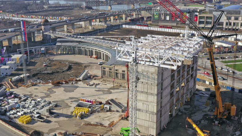 Projekat rekonstrukcije bivše okretnice za parne lokomotive kod Mostarske petlje u Beogradu zvanično je krenuo u realizaciju u februaru 2023. godine, a nakon što smo ovo gradilište prvi put posetili u avgustu prošle godine, ponovo smo se na njemu obreli sredinom marta 2024, kada nam je u oči odmah upala masivna čelična konstrukcija koja visi na vrhu zgrade.
