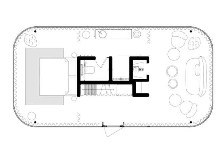 Centralno pozicioniran betonski volumen u svakoj kući objedinjuje kupatilo i kuhinjske instalacije, dok su dnevna zona i spavaći deo organizovani oko njega, ispod kupolastih formi. Pod obložen glatkim oblucima dodatno naglašava kontinuitet sa spoljašnjim prostorom, jer se isti materijal nastavlja i izvan granica staklenih zidova.