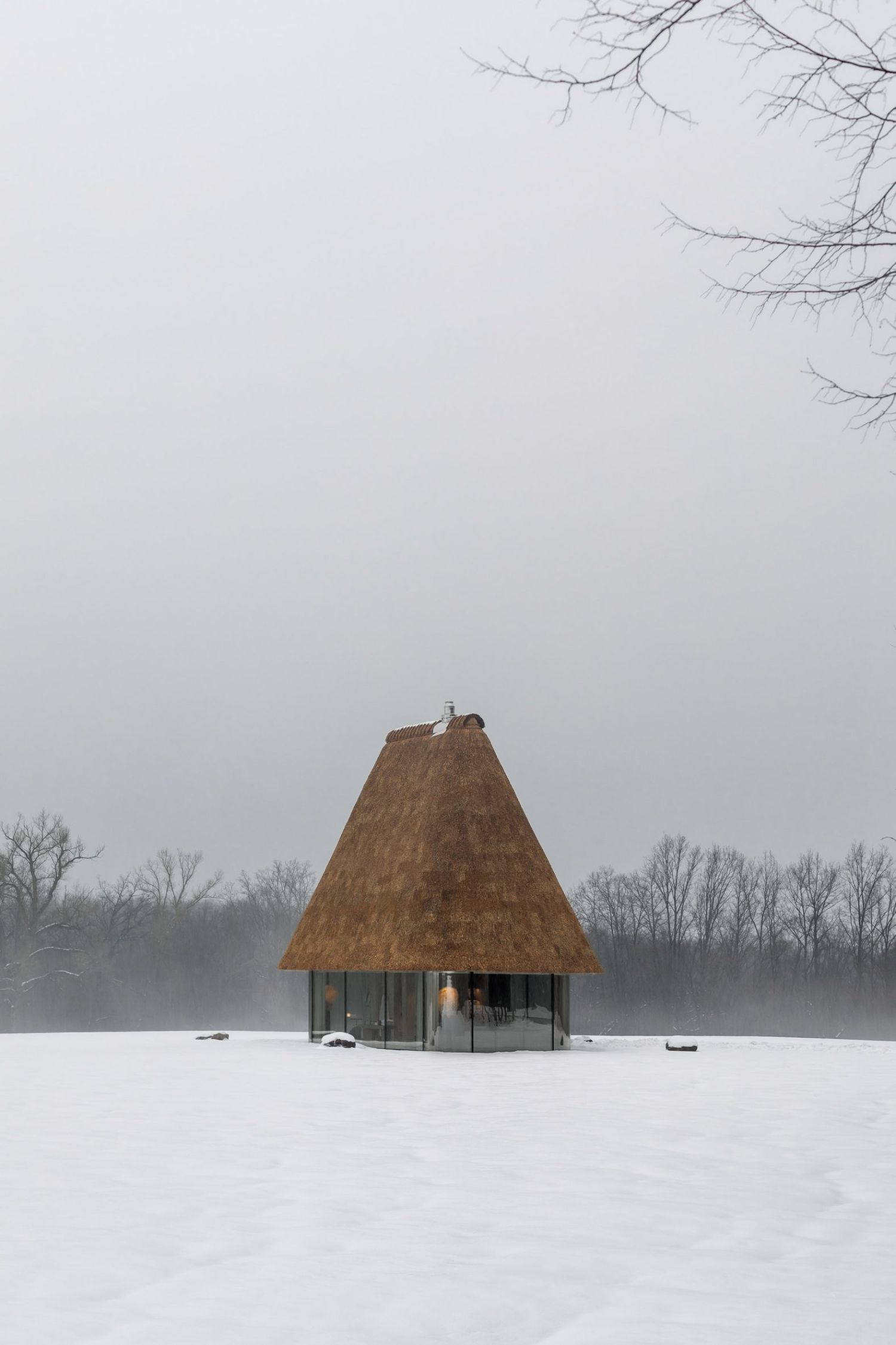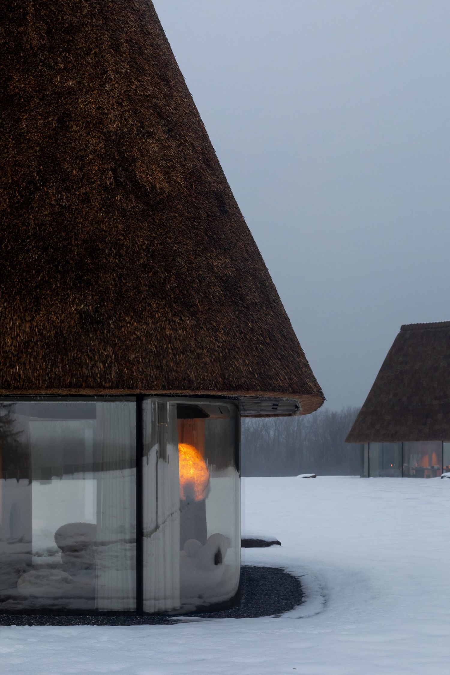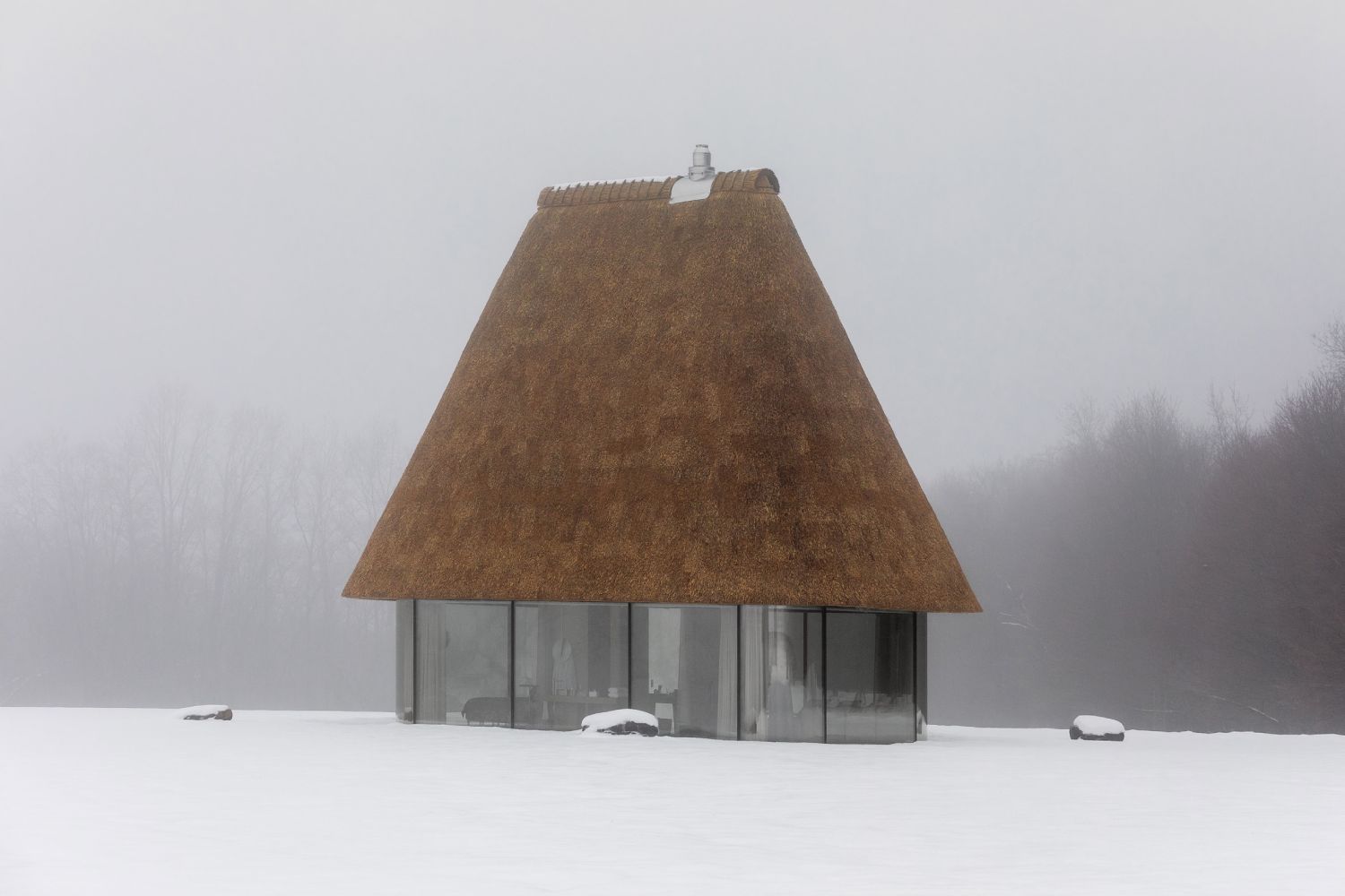 Krovovi visoki 10 metara dominiraju pejzažom, dok staklene fasade brišu granicu između enterijera i prirode.
