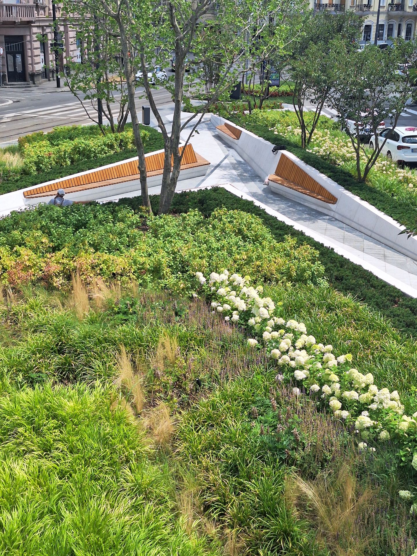 Napravljen je pravi odnos pešačkog prostora i parkovskog rastinja, da prolaznici mogu neometano da prolaze ili da se okupljaju na klupicama, ali i da sam prostor i dalje zadrži karakter parkovske celine.