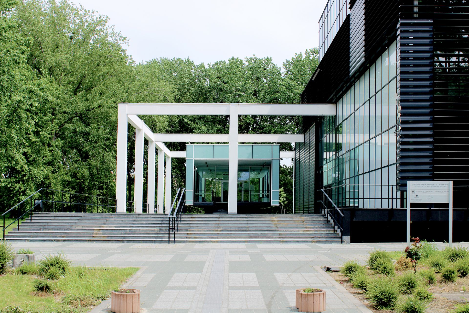 Jednostavni i kompaktni stakleni kubus dodatno je naglašen rešetkastom strukturom brise-soleila kao posebnom tananom i nonšalantnom sekundarnom fasadnom opnom.