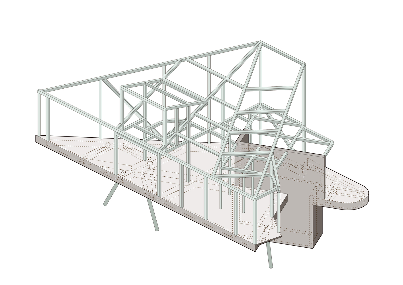 Konstrukcija kuće izvedena je od lakih čeličnih elemenata, što je omogućilo podizanje objekta na stubove uz minimalno opterećenje tla i korenja drveća.