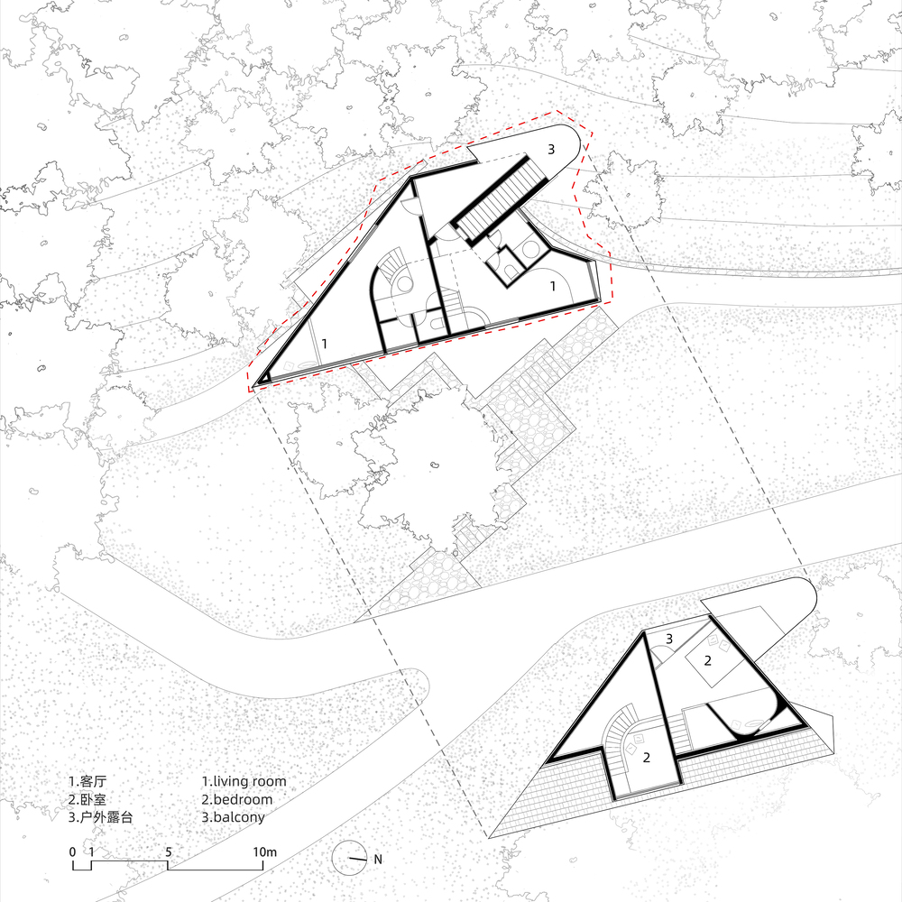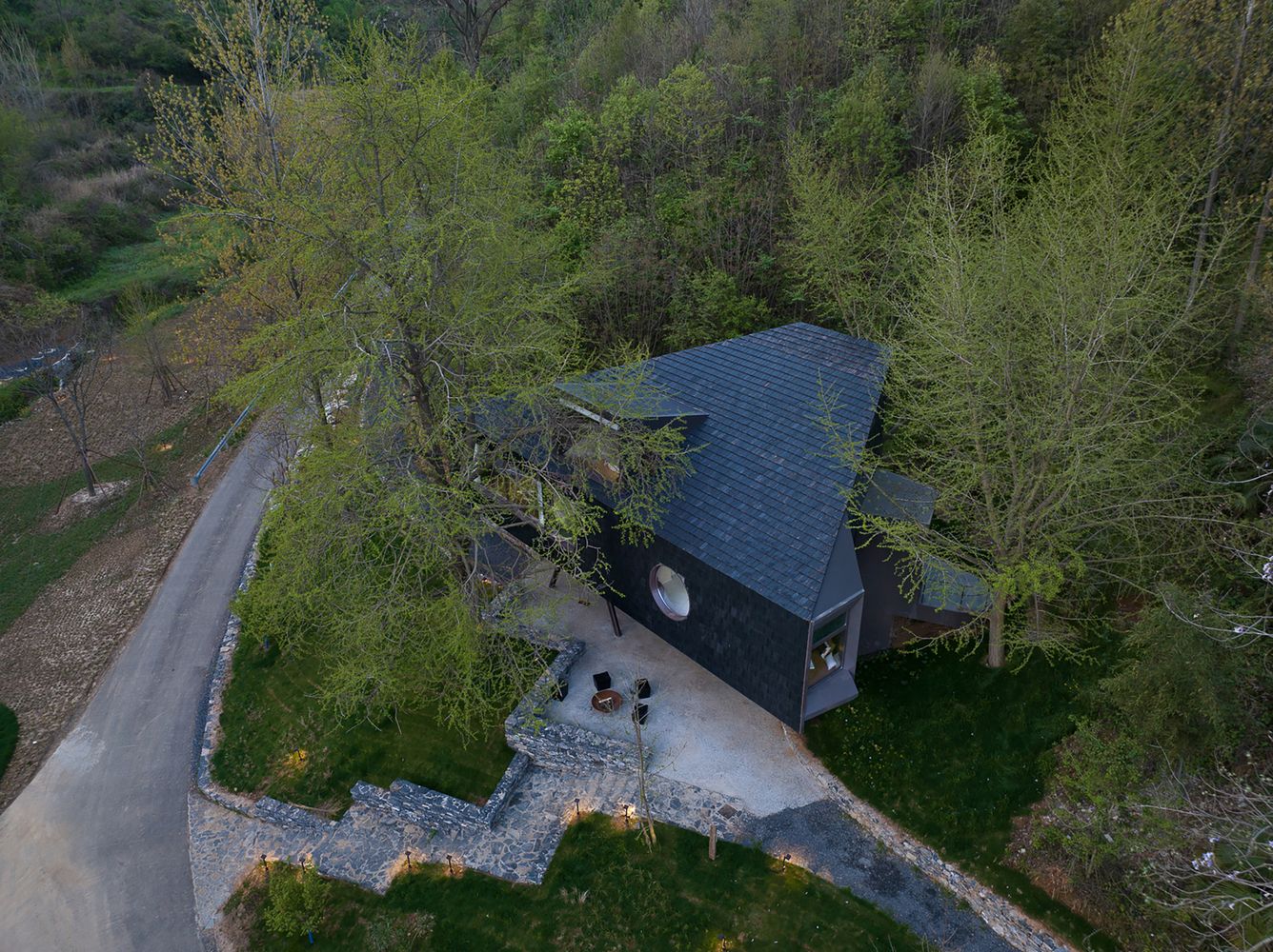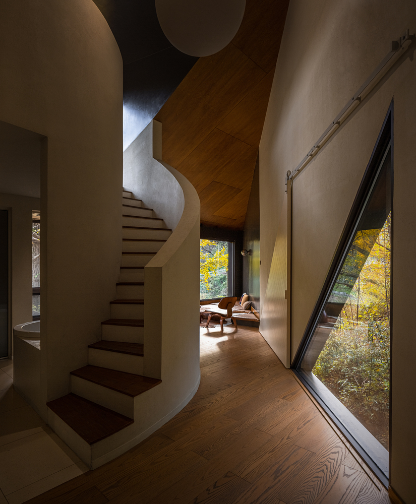Ova kuća od 190 kvadrata, koju su autori opisali kao „masku u šumi“, reaguje na staze i konture drveća lokacije preciznim geometrijskim redom. Svrha geometrijskog oblika nije da direktno predstavi estetsku privlačnost, već da proizilazi iz sinteze dizajnerskih uslova zasnovanih na vizuelnim percepcijama na licu mesta.