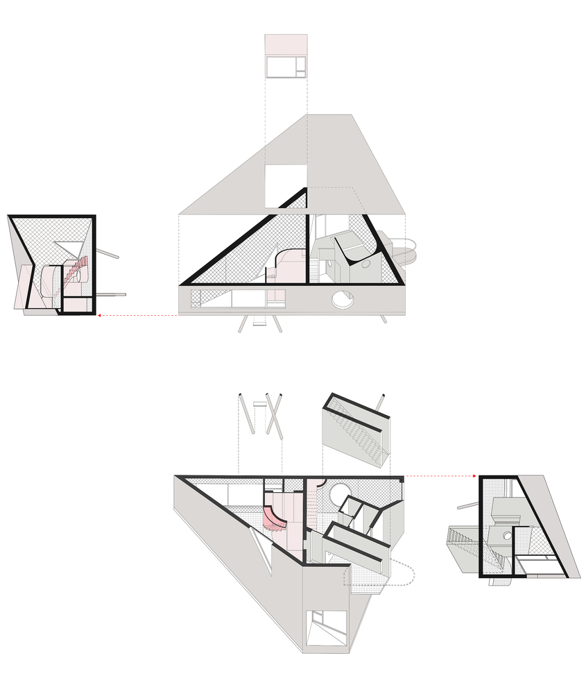 Dizajneri su izvukli geometrijske kontrolne linije iz nepravilne granice parcele i usavršili odnos između zapremine, lokacije i ljudskog tela kroz iteracije plana i preseka. Značajan potez na nivou tla bilo je rotiranje centralnog jezgra stepeništa za 60 stepeni u odnosu na njegovo prvobitno poravnanje vertikalne ose.