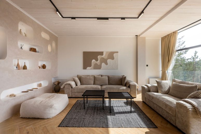 S obzirom na to da je objekat namenjen odmoru i opuštanju, ključno je bilo da nameštaj bude udoban. Stoga je dizajnerka enterijera koristila prirodne tonove i materijale, bez jakih boja, kako bi do izražaja došao spektakularan pogled i prirodne lepote koje ga okružuju.