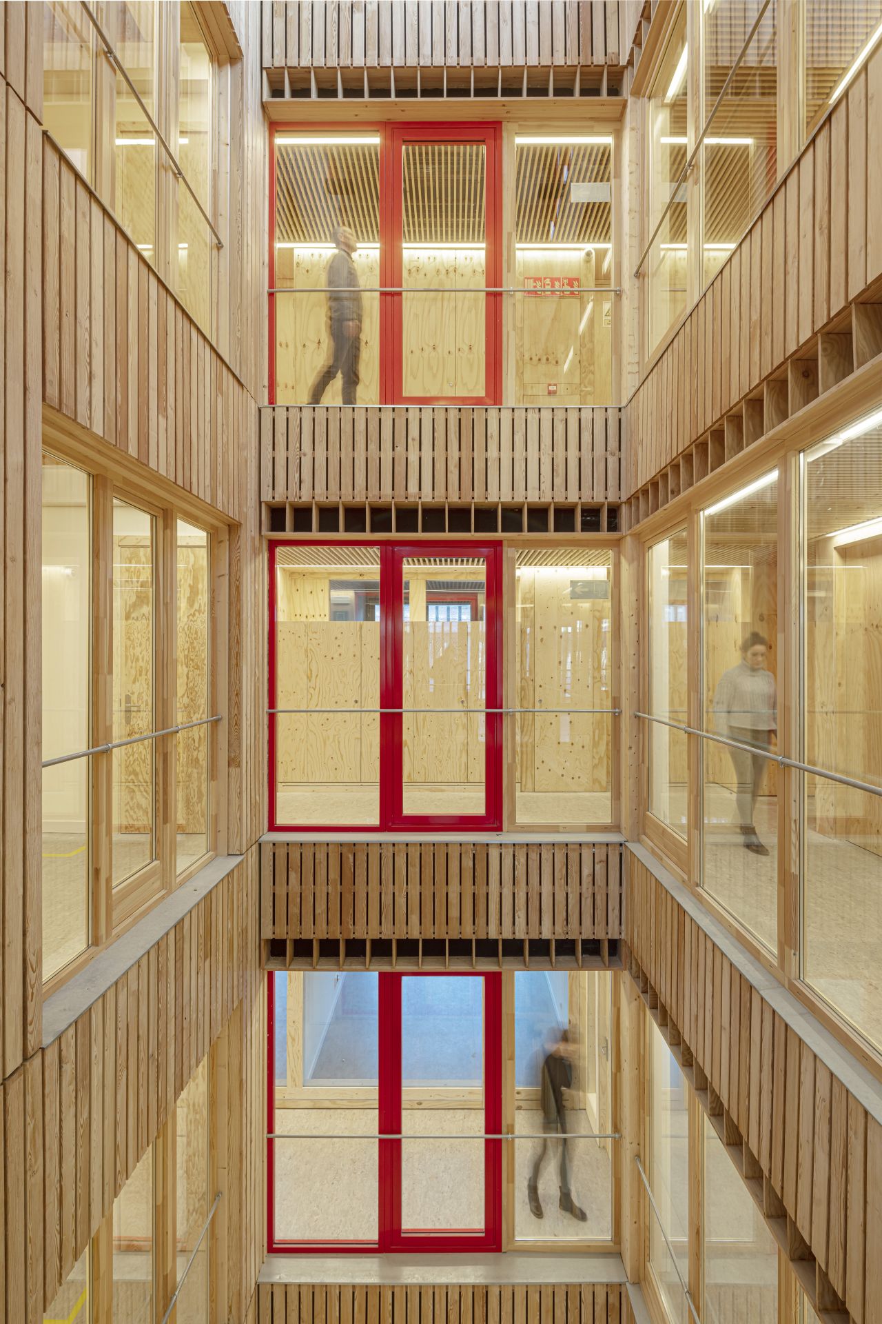 Unutrašnje obloge delom su izrađene od šperploče kako bi se omogućio prolaz električnih instalacija i kablova za prenos podataka, dok ostatak enterijera čine gola CLT konstrukcija i metalni okvir sa vatrootpornom bojom.