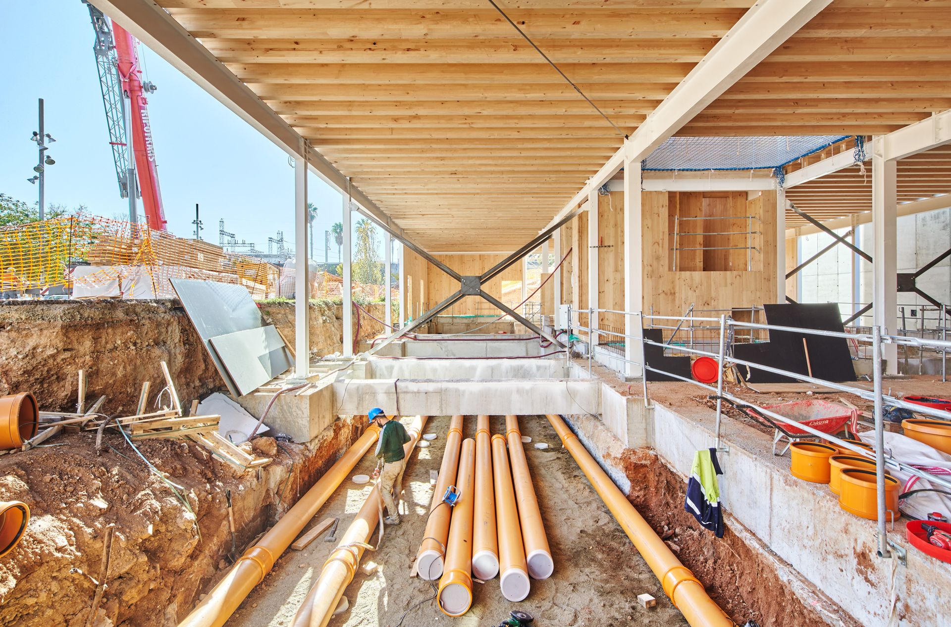 Metalni okvir nosača i stubova postavljen je u kombinaciji s nosivim sistemom od unakrsno lameliranih drvenih panela i plafona.