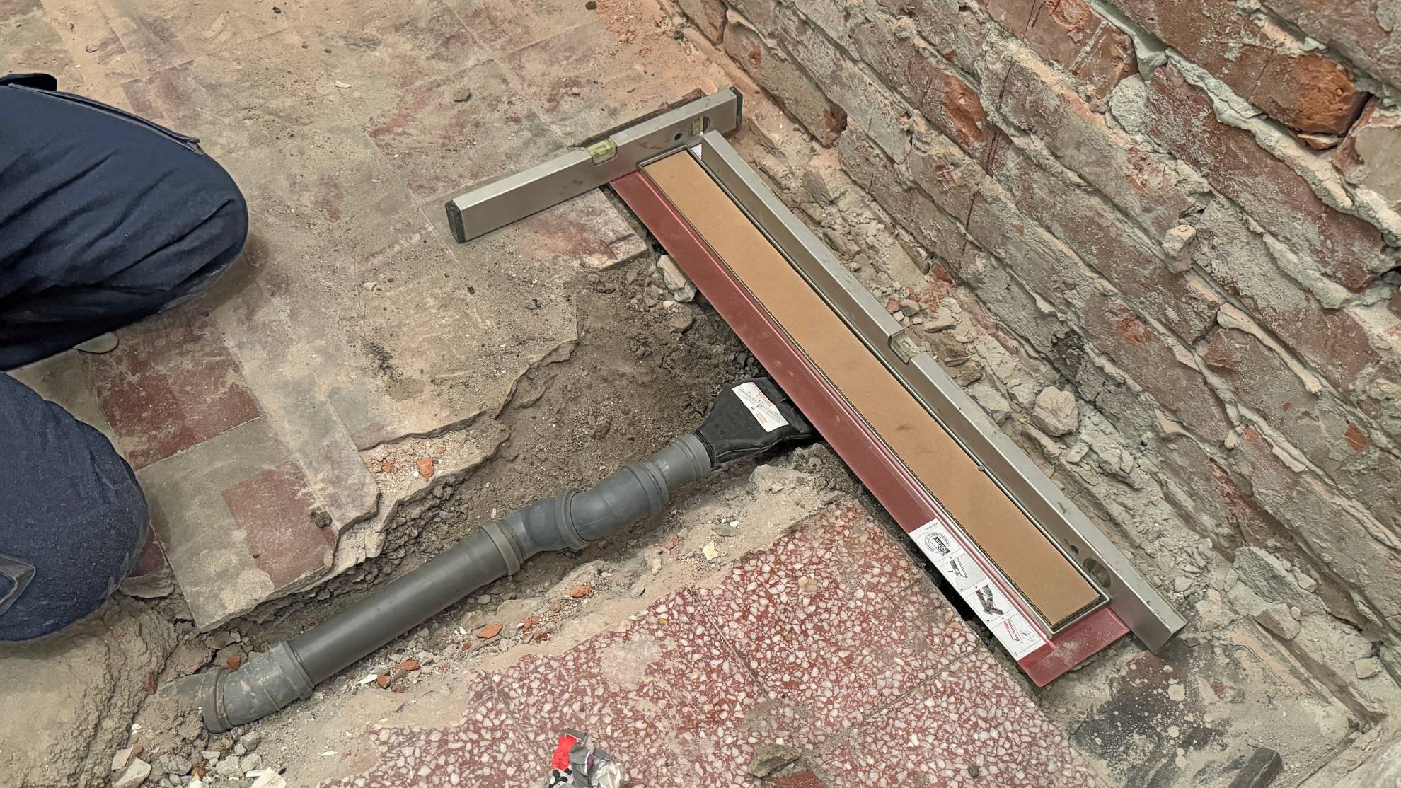 Kada se postavi kanalica, libelom se proverava horizontalnost. Potrebno je da je tuš kanalica ravna s budućim podom.
