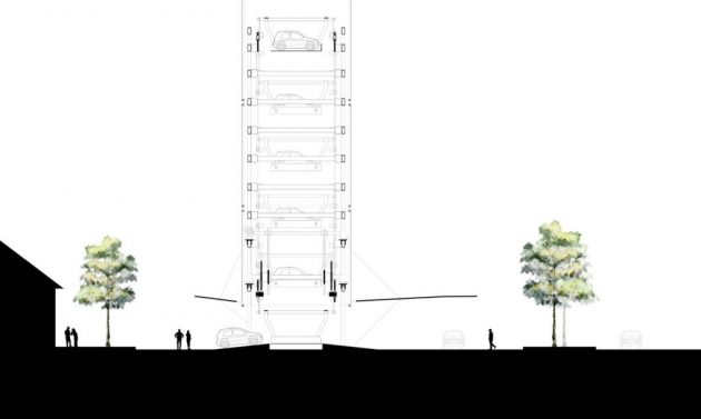 Garaža će imati formu kule sa transparentnim zidovima u kojima će se vozila parkirati u nivoima, a za one koji su u žurbi, postoji prolazni parking na kom se mogu zadržati samo onoliko koliko im je potrebno da napune bateriju vozila.