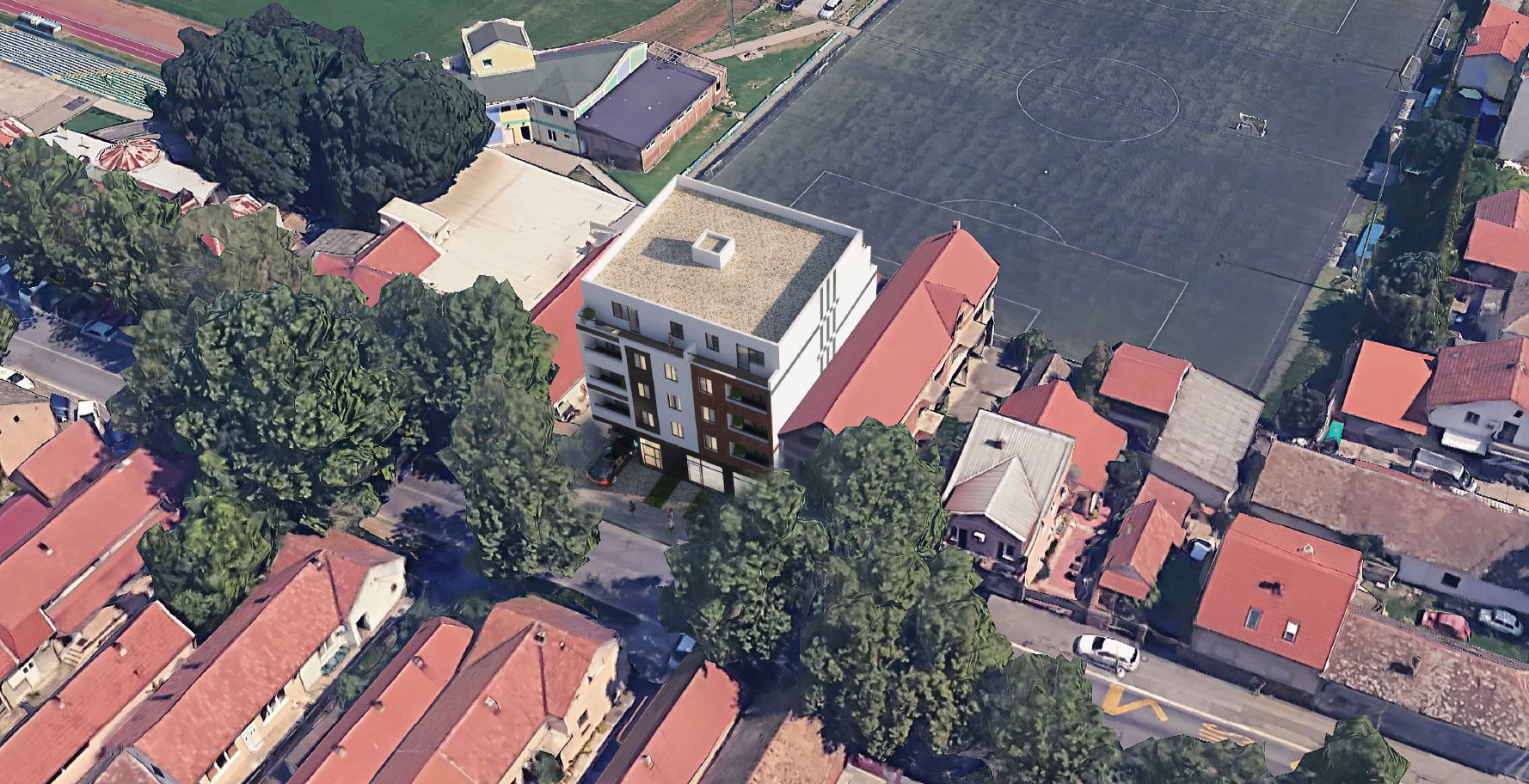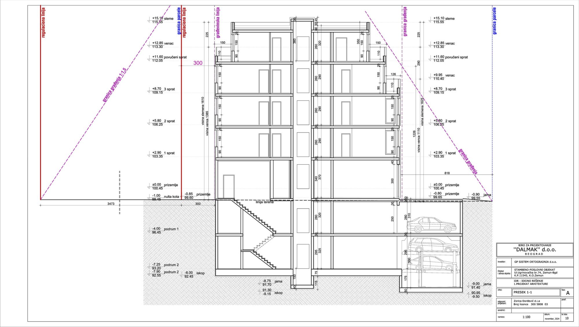 Na mestu porodične kuće u Zemunu planirana je izgradnja objekta spratnosti 2Po+P+3+Ps sa 20 parking mesta i jednim lokalom u prizemlju.