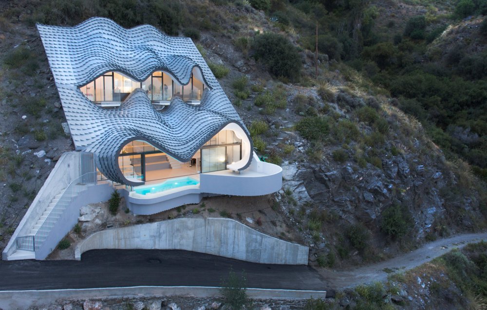 Arhitektonski biro GilBartolome potpisuje projekat neobične kuće na litici koja je potpuno ukopana u teren pod padom 42 stepena. Umesto da grade na ovako strmoj padini, arhitekte su odlučile da dva sprata kuće naprave pod zemljom a da jedino što viri nad terenom bude krov koji oblikom ali i materijalizacijom podseća na… zmaja!?