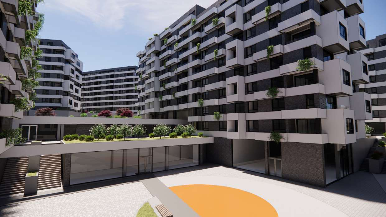 Pozicioniranjem objekata omogućeno je da se formiraju uređene slobodne i zelene površine, prostori za igru dece, obrada partera i urbani mobilijar savremenog izgleda (fontane, klupe) koji dominiraju prostorom.