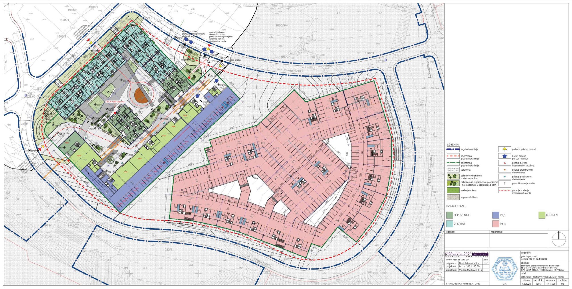 Lamele oba objekta su pozicionirane na kaskadnim i denivelisanim platoima u skladu sa nagibom terena i planiranim saobraćajnim površinama. Sa platoa je omogućen pešački pristup objektima sa pripadajućim lamelama.