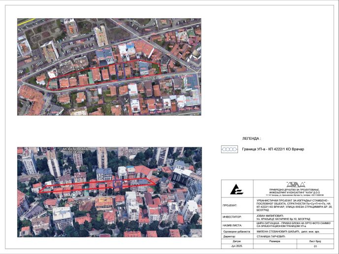Nosilac izrade urbanističkog projekta je Privredno društvo Aula d.o.o. iz Beograda, obrađivač IDR-a je preduzeće Brutarq sa Palilule, kao odgovorni urbanista potpisana je Milena Stevanović Šaljić, dia, a kao odgovorni projektant Miloš Jakšić, dia. Investitor je fizičko lice iz Beograda.