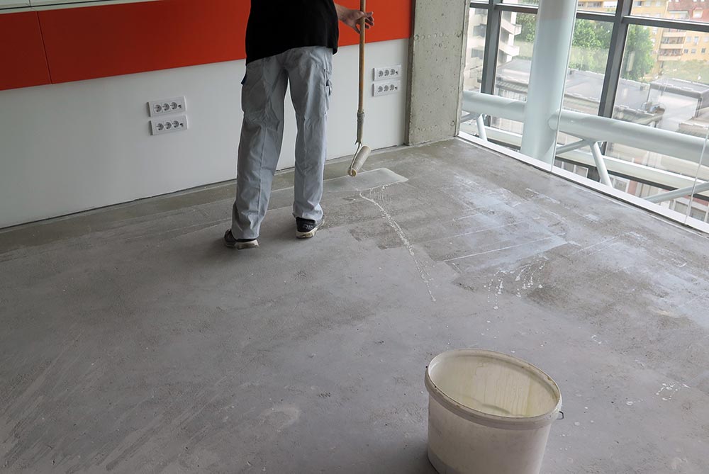 Podloga se isporučuje u kantama, razređuje vodom i nanosi valjkom na pod. Nakon nanošenja podloge, a pre postavke, potrebno je da prođe desetak minuta.