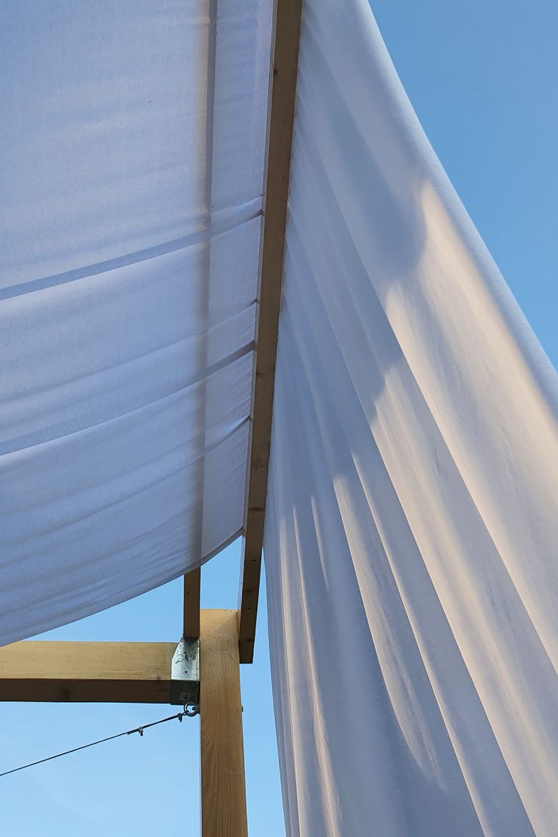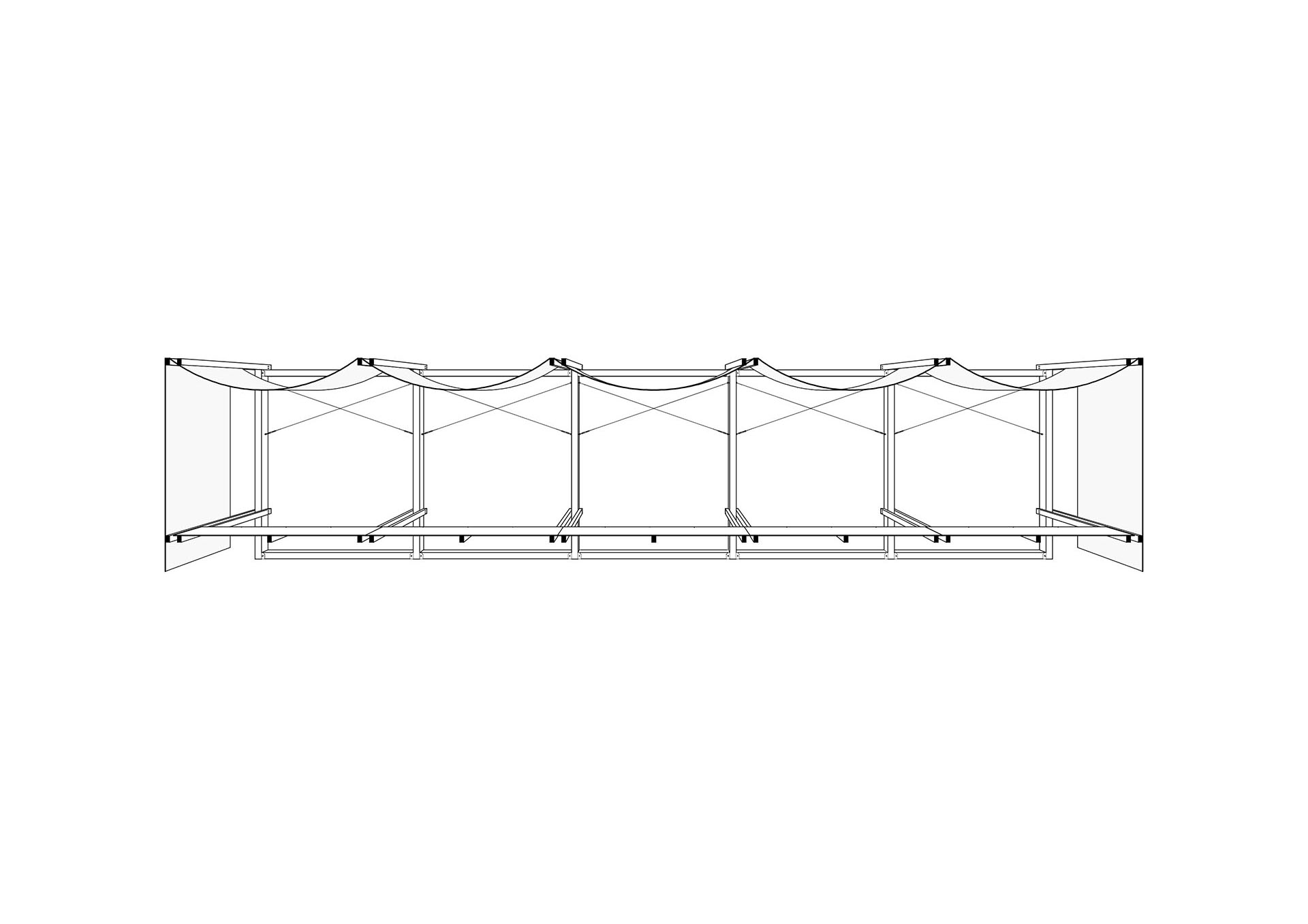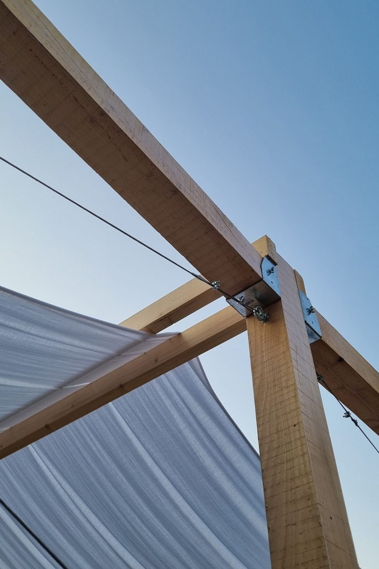 Fizionomija šatre se najdirektnije može opisati kroz vezu stola i šatora (razapetog platna). U slučaju paviljona, šator je glavni konstruktivni element prostorne strukture, i sačinjen je od šest drvenih modularnih ramova. Ramovi, međusobno povezani i ukrućeni drvenim gredama i zategama, nose stolove i laganu platnenu nadstrešnicu.