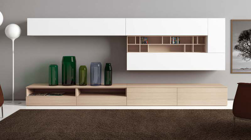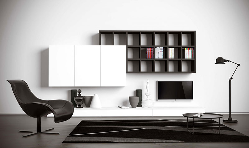 Donji deo modela na slici ispod nije konzolno okačena na zid nego leži na podu. Televizor u ovom slučaju je neophodno postaviti na zid uz pomoć nosača. Zanimljiv je jak kontrast boja na gornjem delu police koji naglašava različitost visećih elemenata: potpuno otvoreni izložbeni prostor i zatvorene police velikih dimenzija.