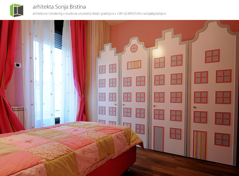 Nameštaj u dečijoj sobi ne bi trebao biti klasične forme i dosadnih boja. U ovom slučaju ormar je izveden u obliku kućica gde je svaka kućica predstavlja jedno krilo ormara.