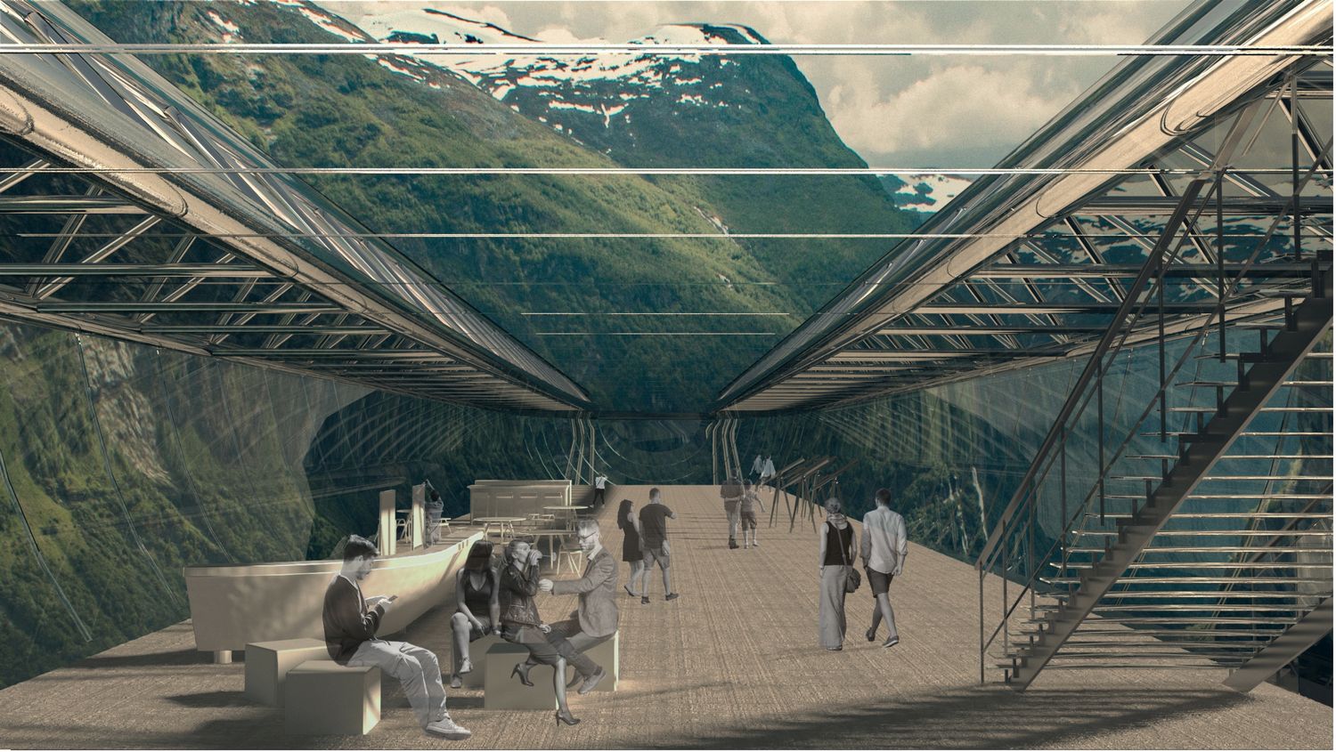 Ulaskom u staklenu kapsulu, dočekani ste s neometanim pogledom na okruženje. Tenzična pozicija objekta koji „visi“ sa litice dodatno je naglašena čeličnom prostornom rešetkom, koja pored konstruktivnih karakteristika doprinosi i vizuelnom kvalitetu arhitektonskog rešenja. Arhitektura postaje sredstvo pomoću kojeg se uspostavlja kvalitetna veza između ljudskih aktivnosti i prirode i usložnjava opažanje zatečenog konteksta.