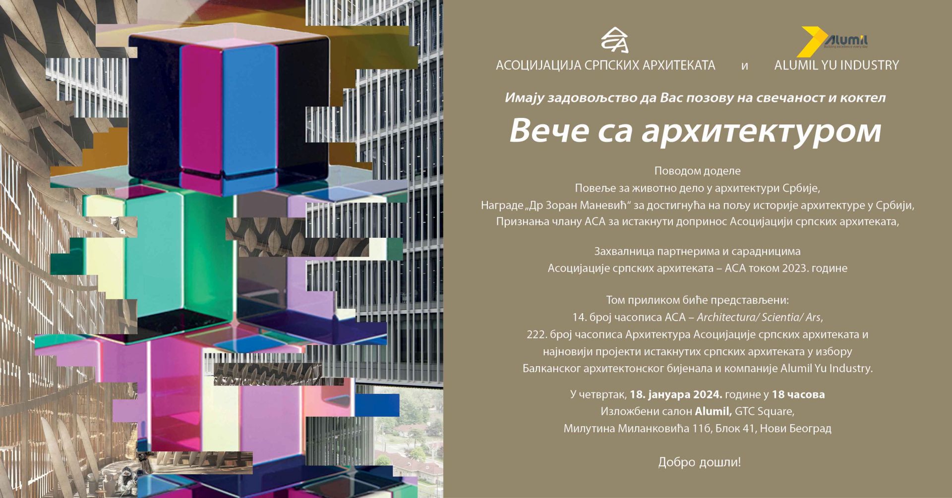 Asocijacija srpskih arhitekata – ASA i kompanija Alumil Yu Industry pozvali su javnost na svečanost pod nazivom „Veče sa arhitekturom“, koja će biti održana u četvrtak, 18. januara 2024. godine, u Izložbenom salonu Alumila na Novom Beogradu.