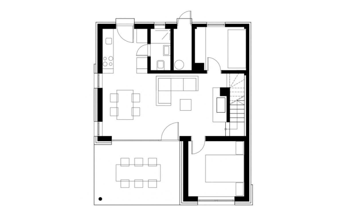 Arhitekte su vešto objedinile tri male sobe s kuhinjom u jedinstvenu kombinovanu prostoriju, otvorenog plana. Centralni motiv nove organizacije je kamin – koji čini vizuelno i organizaciono težište objekta.