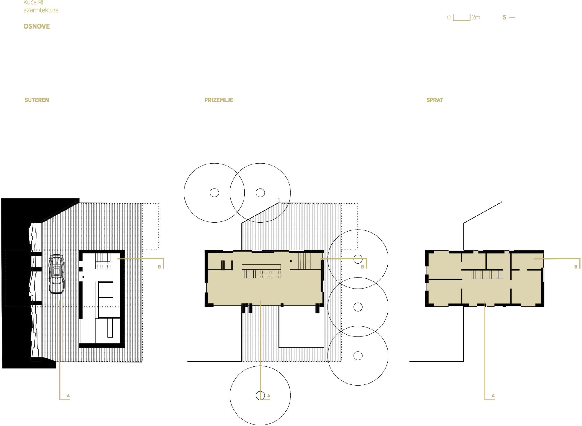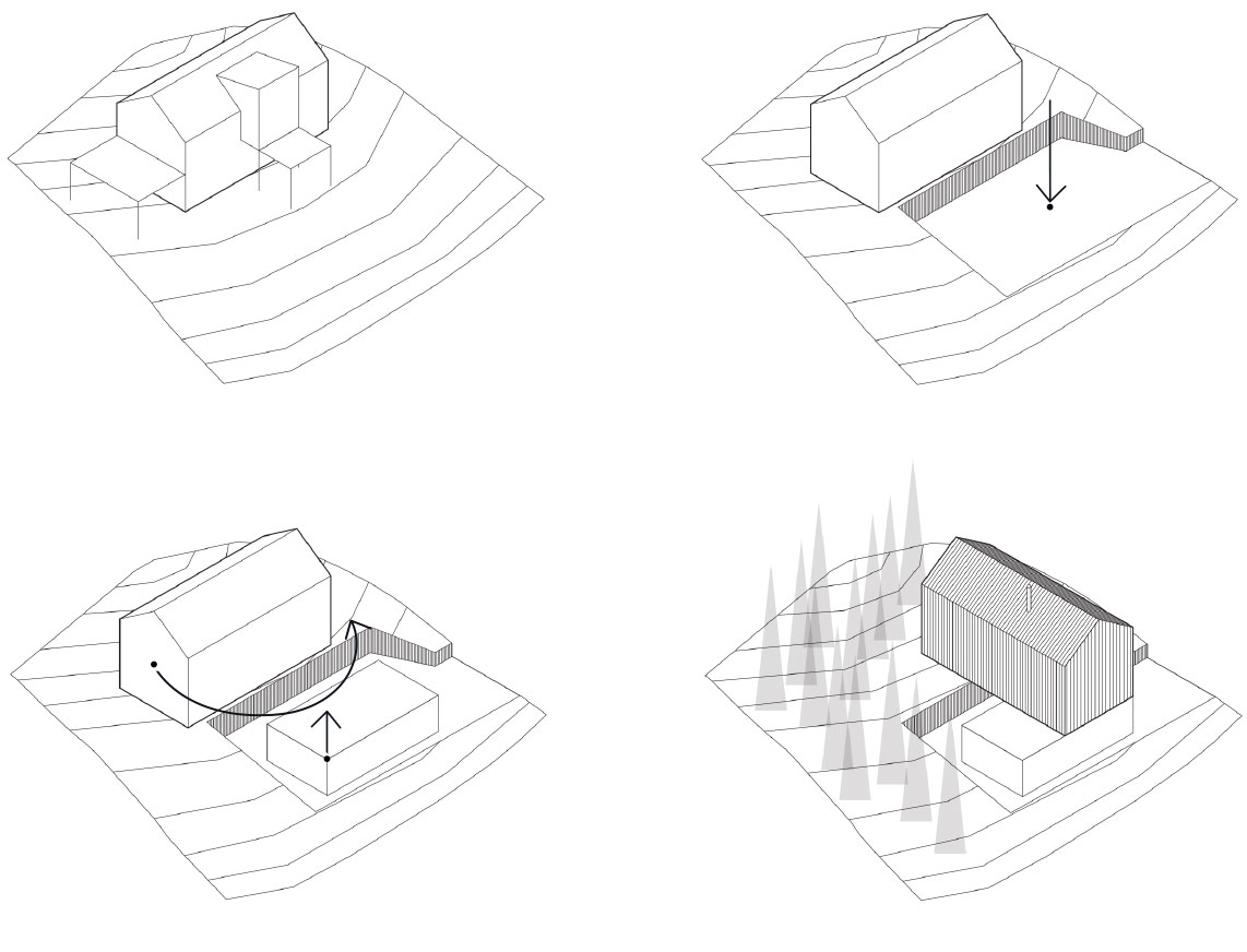 “Tako se, u cilju bolje orijentacije same kuće, formiranja natkrivenog prilaznog dela i smanjenja kontaktne zone za plitko ukopavanje objekta radi temeljenja, koncept ogleda u odluci projektanta da se izvrši rotacija kuće za 90° i ispod nje ‘podmetne’ armiranobetonski postament koji će ujedno biti fundament za objekat i ulazna zona u kuću, čime se postižu prethodno definisani ciljevi”, objašnjavaju iz studija.
