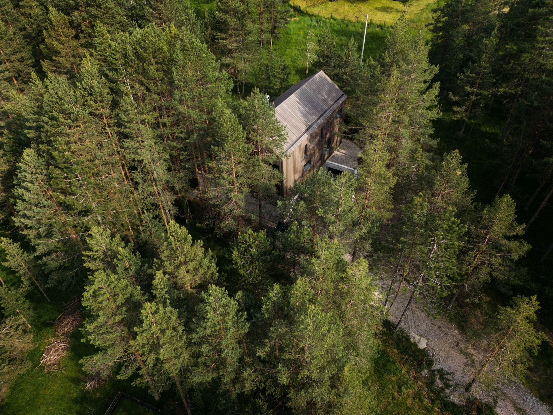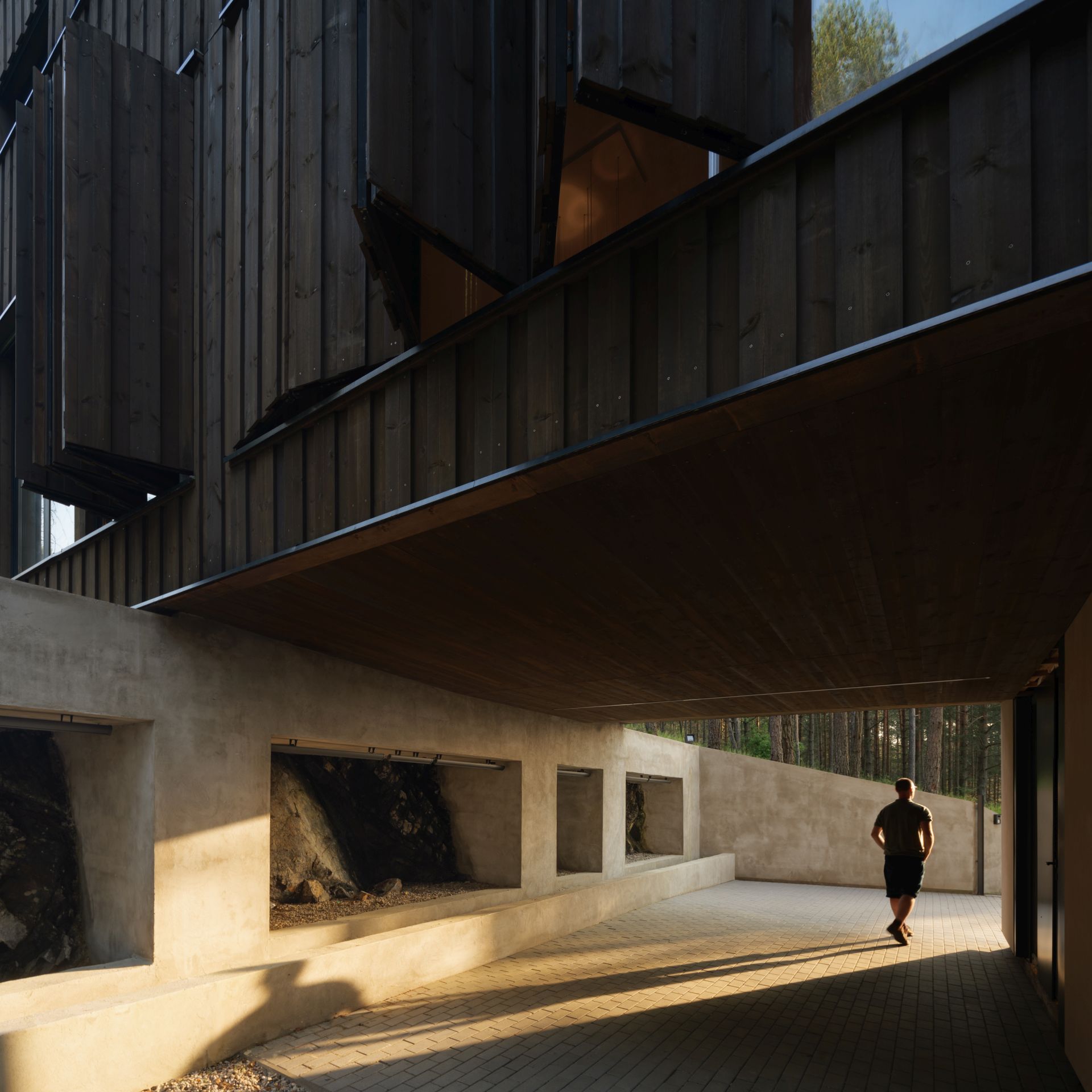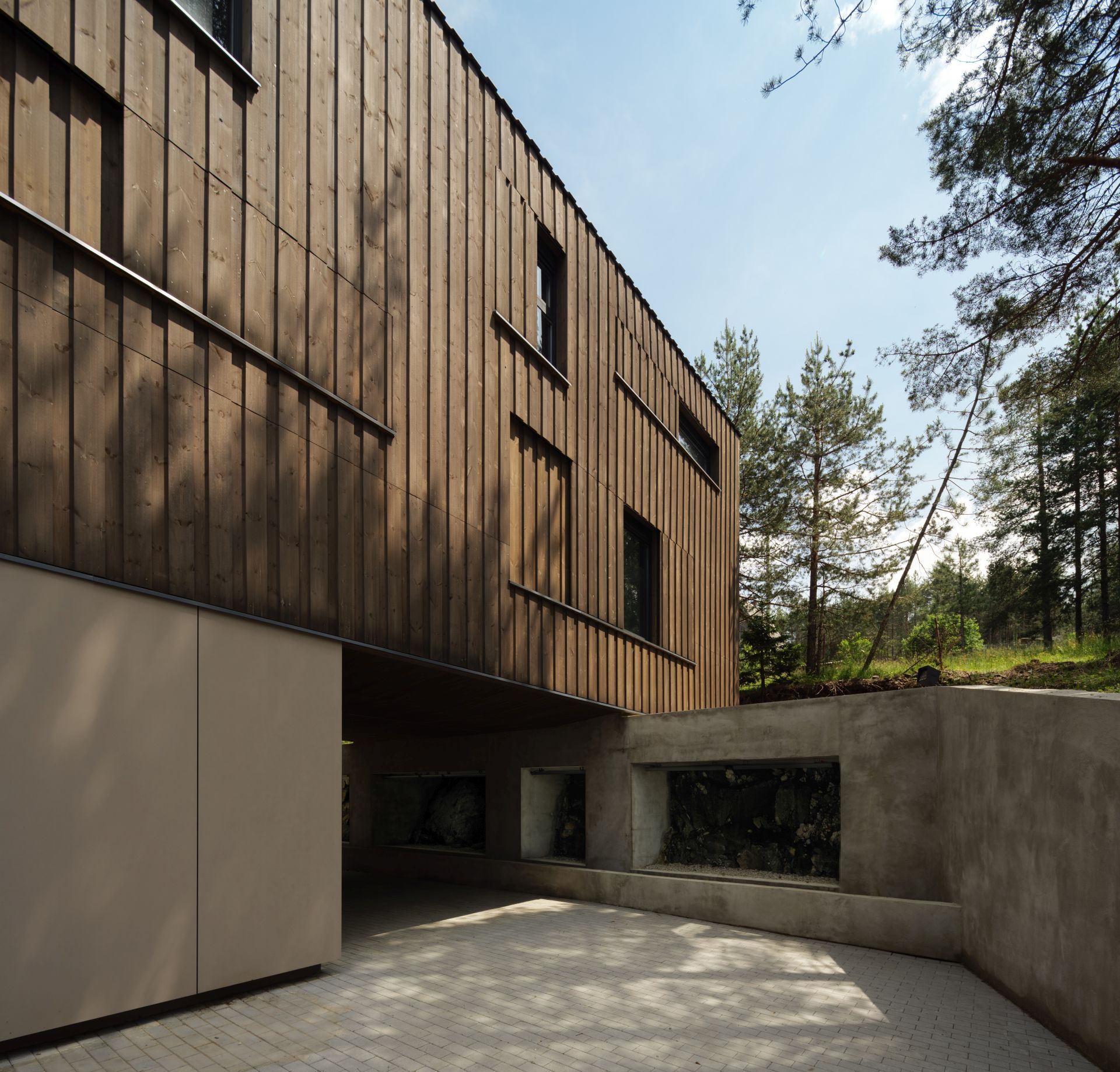 „Tako su fasada i krov završno obloženi daskom od sušenog bora sa izraženim vertikalnim elementima kako bi se u maksimalnoj meri stopio gabarit objekta u postojeće okruženje, što je dodatno postignuto izborom završnog tona drveta koji je određen kao najpribližniji srednjem tonu kore okolnih četinarskih stabala“, navode arhitekte i nastavljaju: