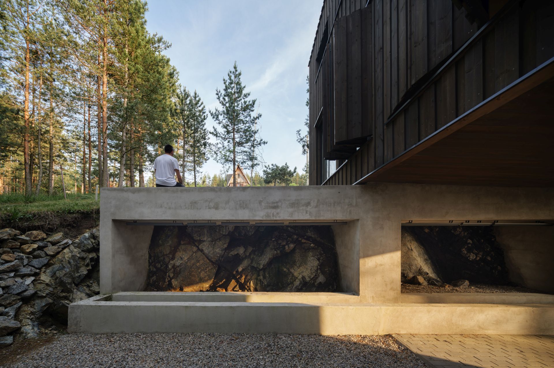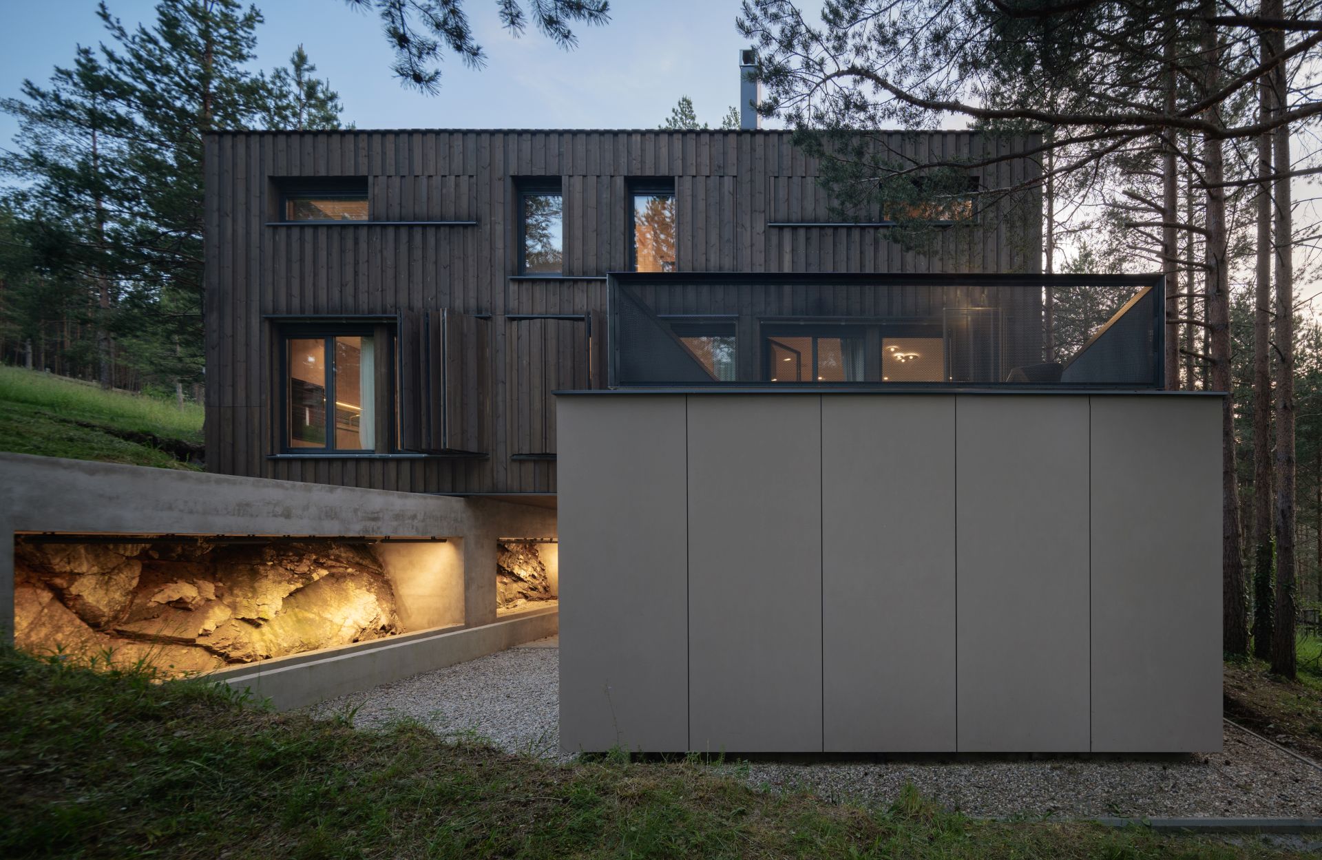 „Južna fasada se svojom konstrukcijom oslanja na prirodnu stenu koja se nalazi na parceli, dok je ispod severnog dela objekta projektovan ulaz u objekat kao zatvoreni, čvrsti blok koji pored vertikalne komunikacije u ulaznoj zoni predviđa prateće sadržaje i boravak na otvorenom kojem se prilazi iz dnevne zone, odnosno prizemlja kuće“ – kažu iz studija a2arhitektura.