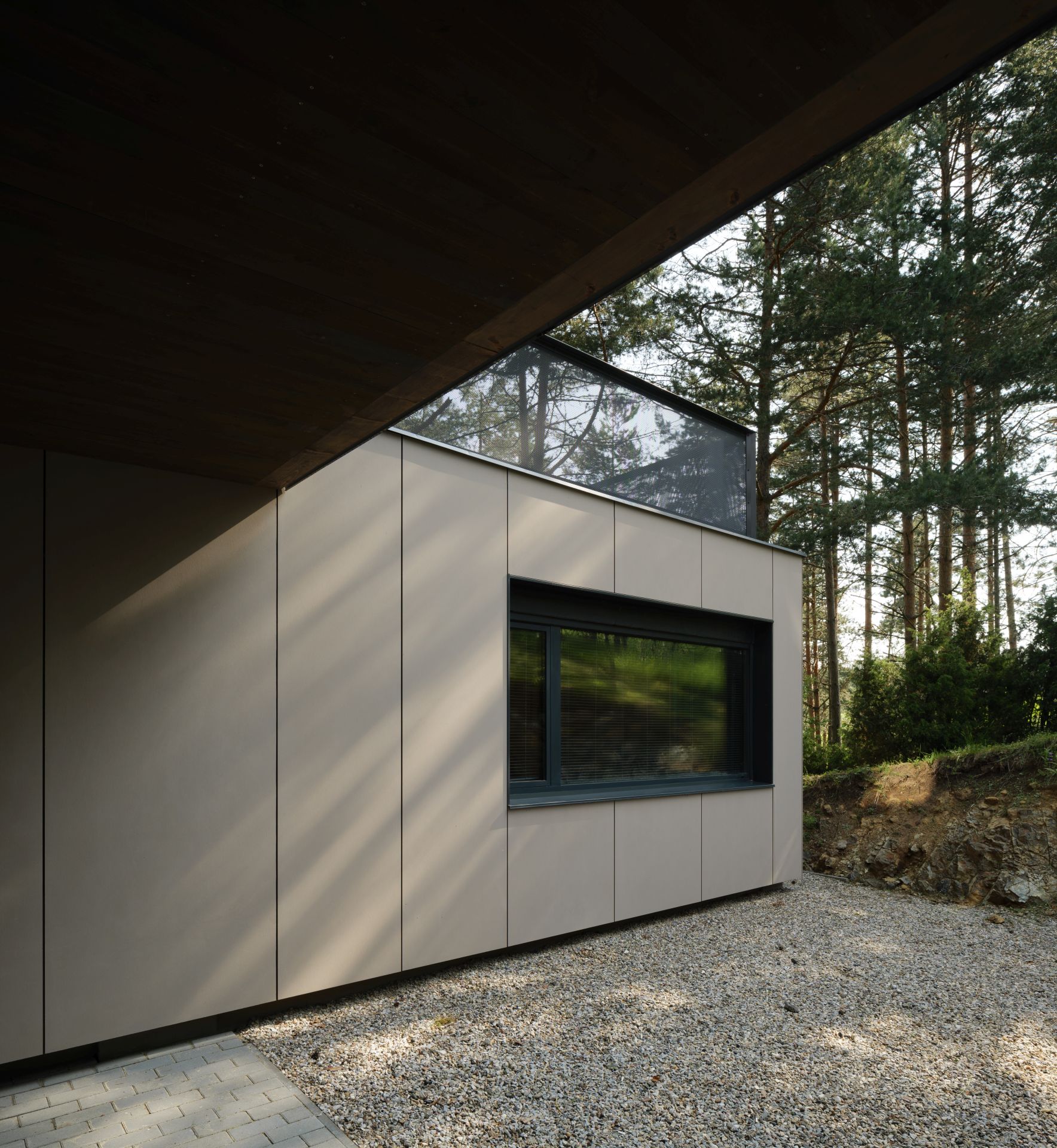 Takvo pozicioniranje objekta na parceli rezultiralo je boljom orijentacijom dnevne i spavaće zone, kao i ostvarenju boljih vizura prema prirodnom okruženju guste borove šume, ističu autori.