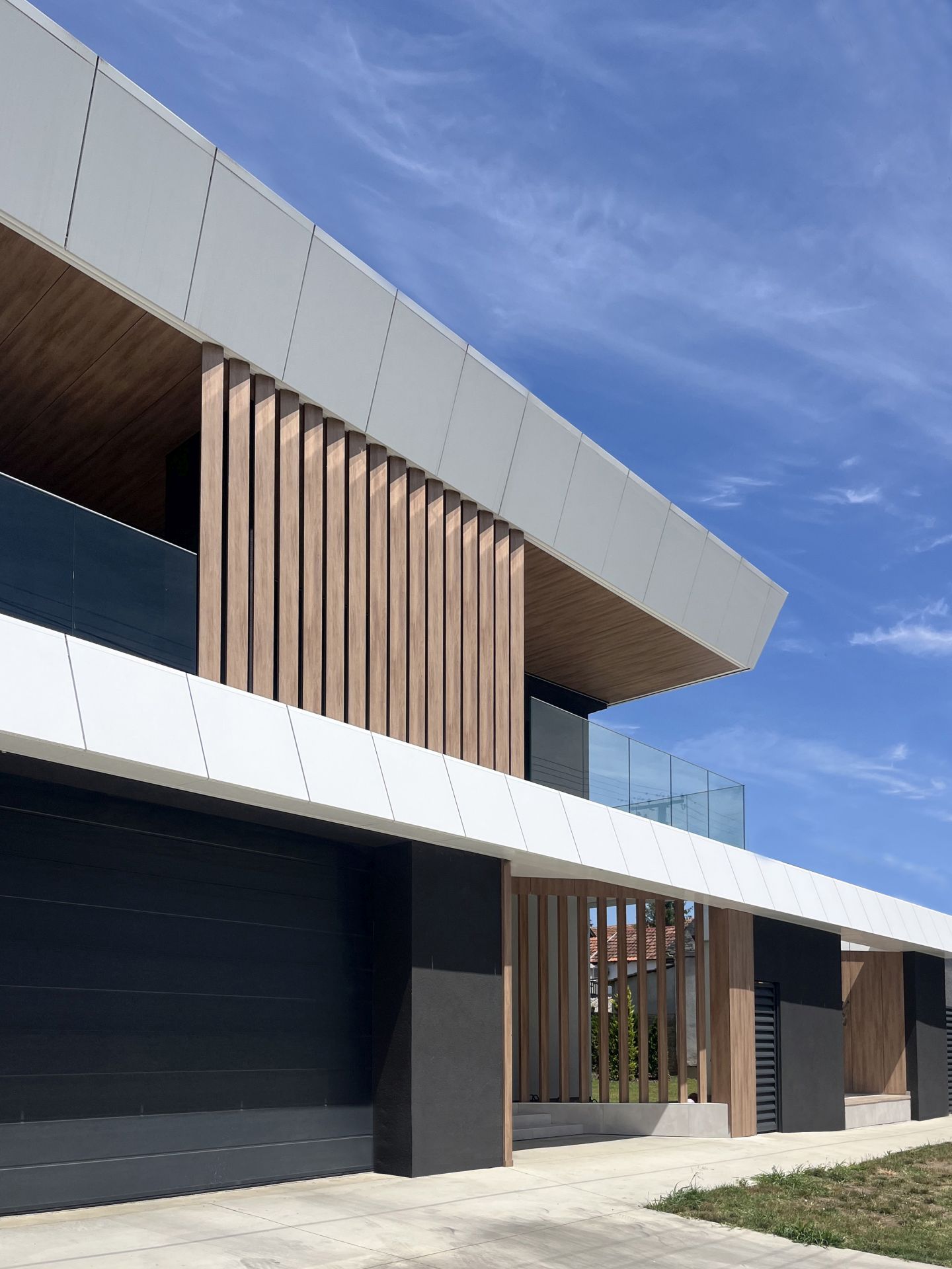 Kako za Gradnju navode iz Pujo A&D, arhitektura eksterijera zasniva se na jasno definisanim linijama i kontrastima materijala. „Svetli volumeni fasade povlače se u senku natkrivenih terasa, dok drveni vertikalni paneli ublažavaju strogu geometriju i unose prizvuk prirodnog“, kažu iz beogradskog studija.
