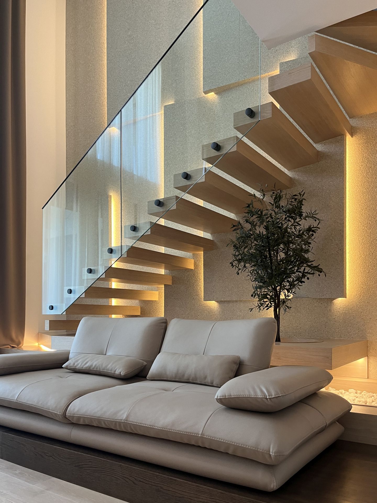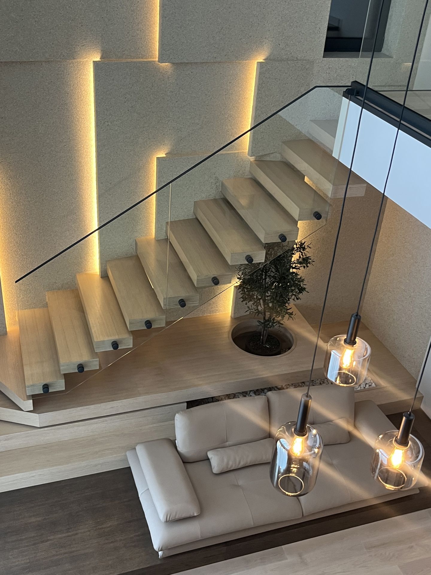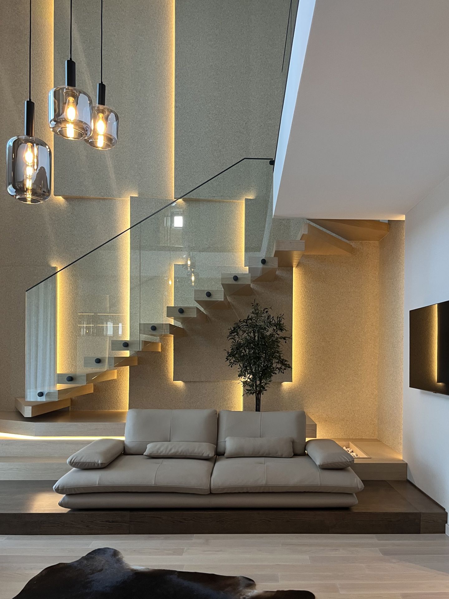 Stepenište lebdi uz zid, elegantno i diskretno, dok vertikalne linije rasvete prate njegovu putanju, dodatno naglašavajući monumentalnost prostora. Zidne obloge u kombinaciji drveta i indirektne rasvete stvaraju teksturu i dubinu, čineći enterijer vizuelno bogatim i prostorno slojevitim“.