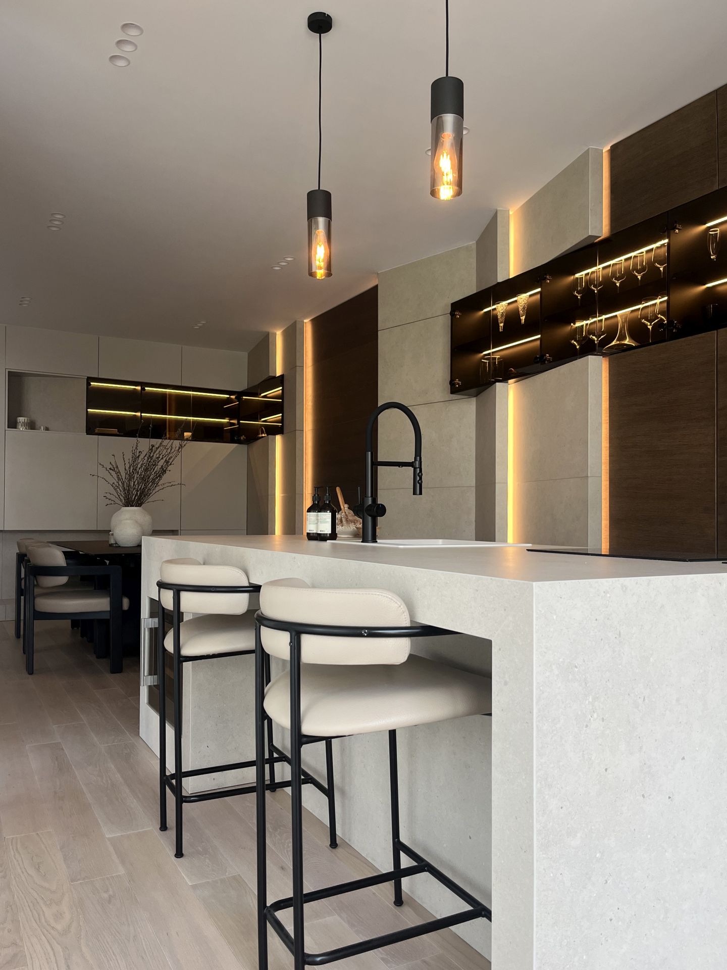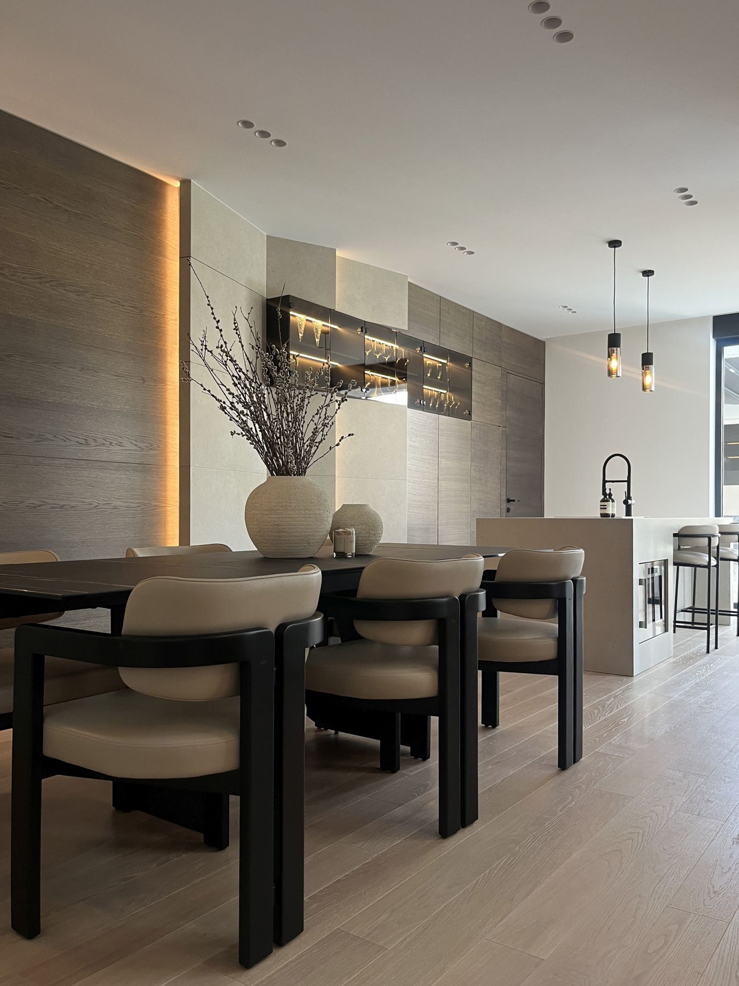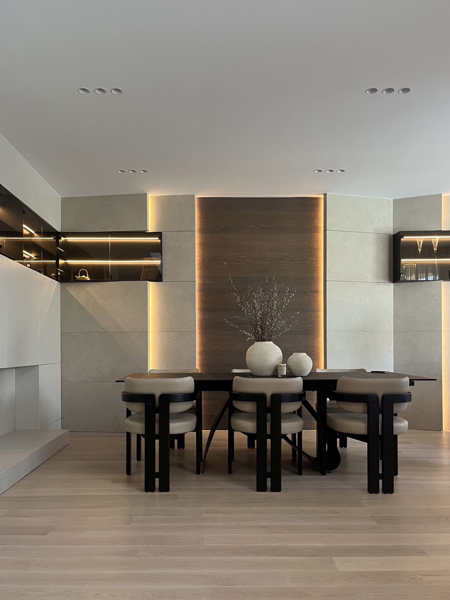Stepenište lebdi uz zid, elegantno i diskretno, dok vertikalne linije rasvete prate njegovu putanju, dodatno naglašavajući monumentalnost prostora. Zidne obloge u kombinaciji drveta i indirektne rasvete stvaraju teksturu i dubinu, čineći enterijer vizuelno bogatim i prostorno slojevitim“.