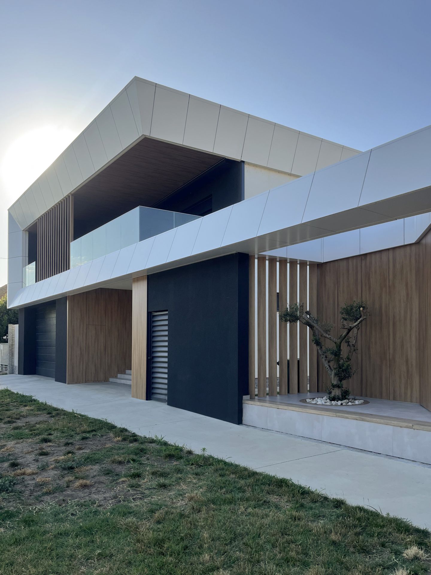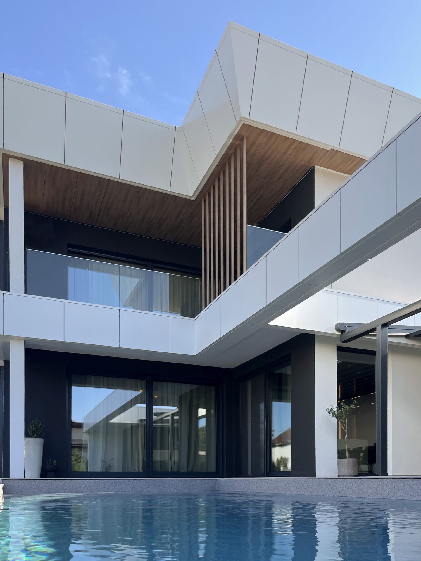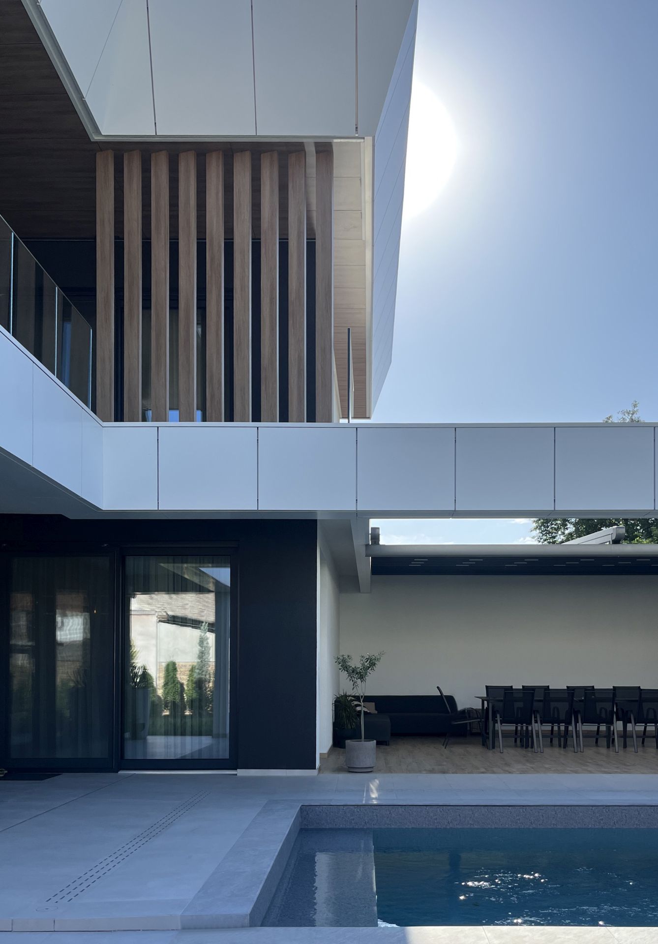 Kako za Gradnju navode iz Pujo A&D, arhitektura eksterijera zasniva se na jasno definisanim linijama i kontrastima materijala. „Svetli volumeni fasade povlače se u senku natkrivenih terasa, dok drveni vertikalni paneli ublažavaju strogu geometriju i unose prizvuk prirodnog“, kažu iz beogradskog studija.