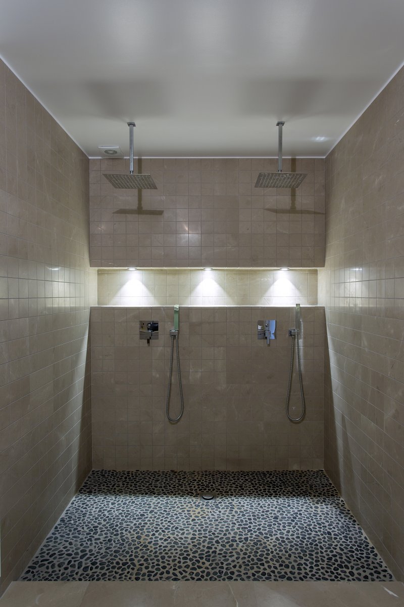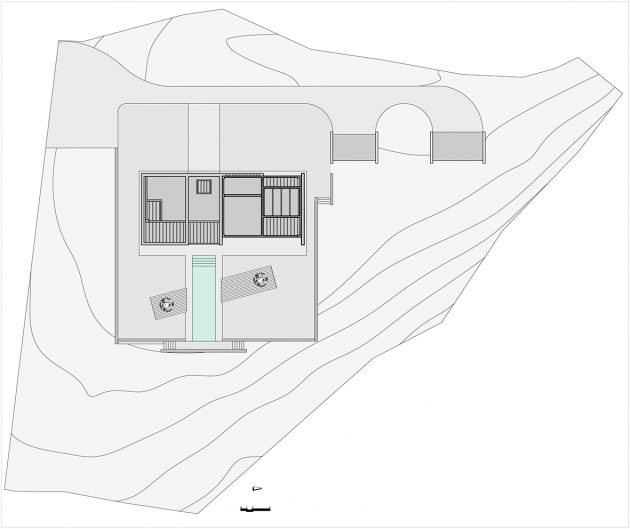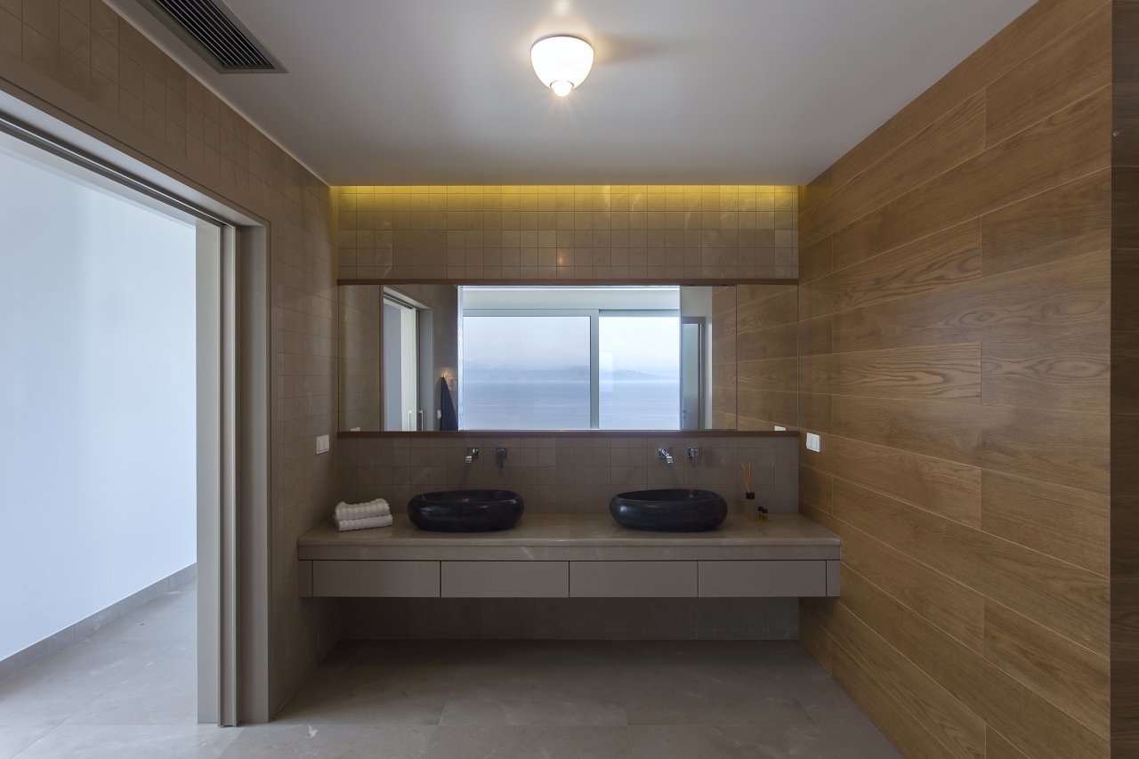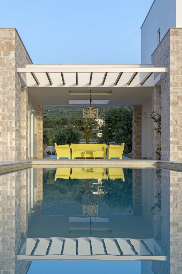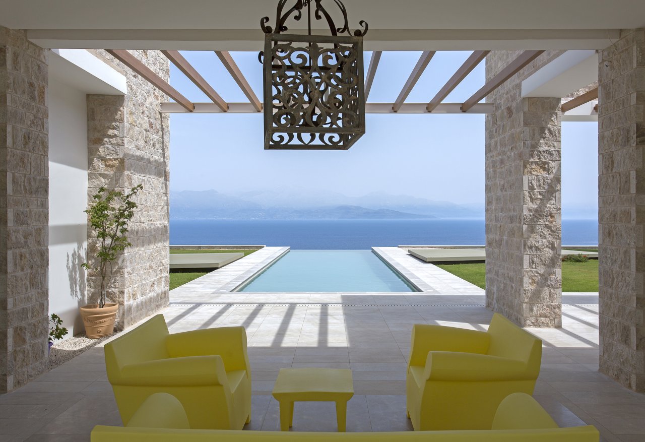 Objekat je postavljen tako da gost prvo vidi portal koji spaja dve kuće i koji uramljuje pogled ka drvetu s žutom garniturom, infinity bazenu čija se ivica spaja s morem i planinama Tajget koje se vide u daljini. Ova harmonijska sekvenca postignuta je upotrebom odgovarajućim materijala. Isti onaj mermer koji je korišćen za popločavanje terase ujedno uokviruje i bazen, dok kamen na prizemlju pravi jednu vrstu rama koji uokviruje idiličnu sliku.