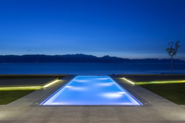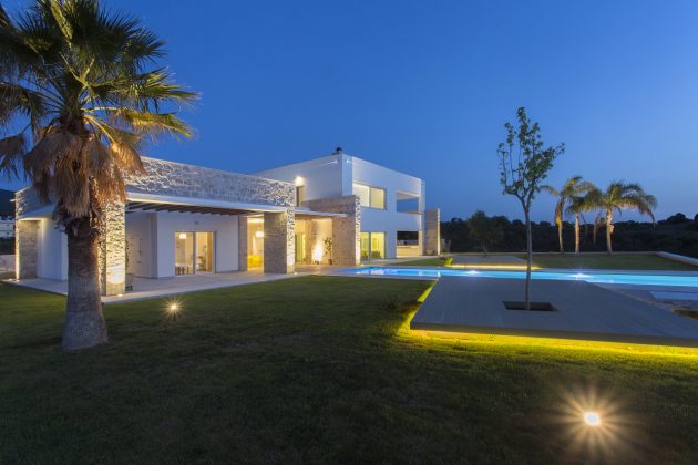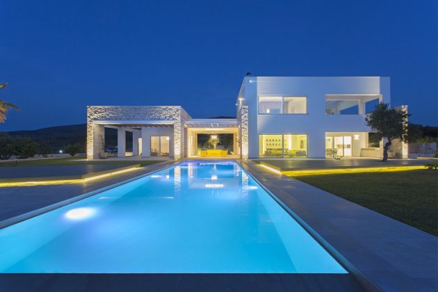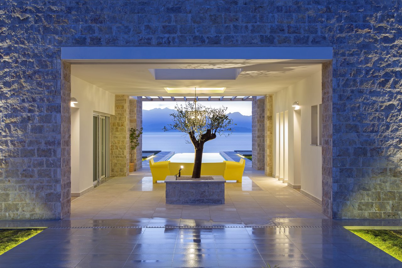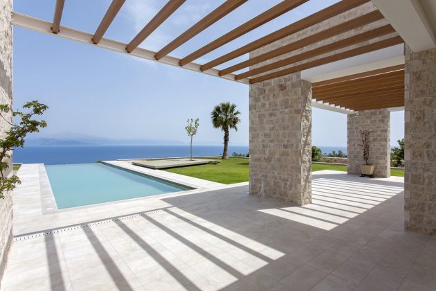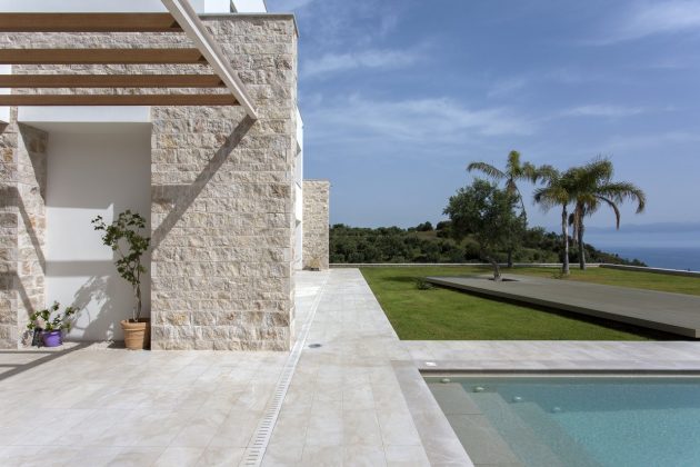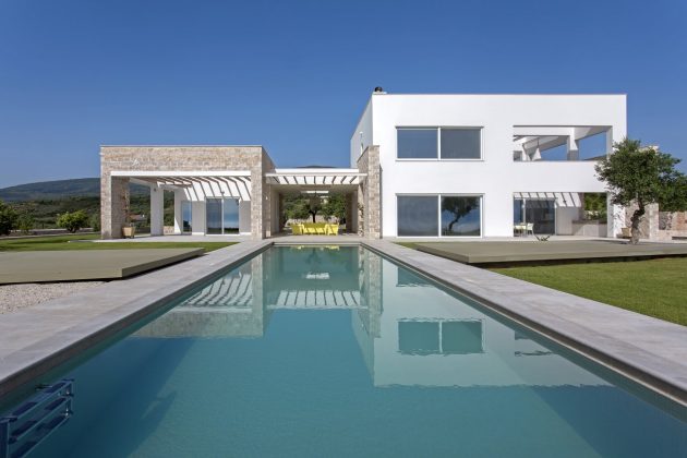 Vila, po projektu biroa MGXM Architects, smeštena je na brdašcu i relativno je blizu obali koja se proteže duž zapadne strane Mesinijskog zaliva na Peleponezu. Sastoji se iz dva volumena koji su povezani terasom koja tokom leta služi i kao dnevni boravak. Ugođaj boravka na otvorenom, pored dugačkog bazena i pogleda na more, obogaćuje i stablo masline koje, kao i sva ostala stabla na placu, nisu posečena tokom gradnje kuće.