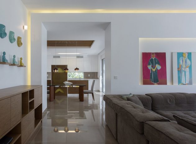Kuća od 330 kvadrata ima dva nivoa: na prizemlju je dnevni boravak, kuhinja i trpezarija dok su na spratu smeštene spavaće sobe. Veliki otvori na obe etaže omogućavaju sjajan pogled na okolinu, a pritom je zagarantovan priliv velike količine svetlosti. U enterijeru su korišćeni svetli tonovi koji se na pojedinim mestima ugašeni teksturama drveta.