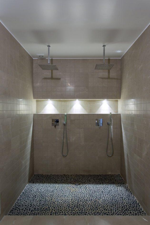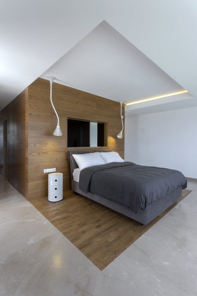 Spavaćom sobom na spratu dominira drveni kubus koji je isto vreme uzglavlje kreveta ali i toalet koji se krije iza zida. Maštu na odmoru podstaknuće i prozor iznad kreveta koji iz toaleta pruža pogled ka moru. Bezobrazne arhitekte…