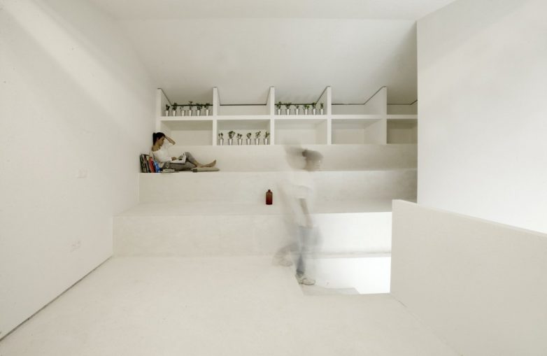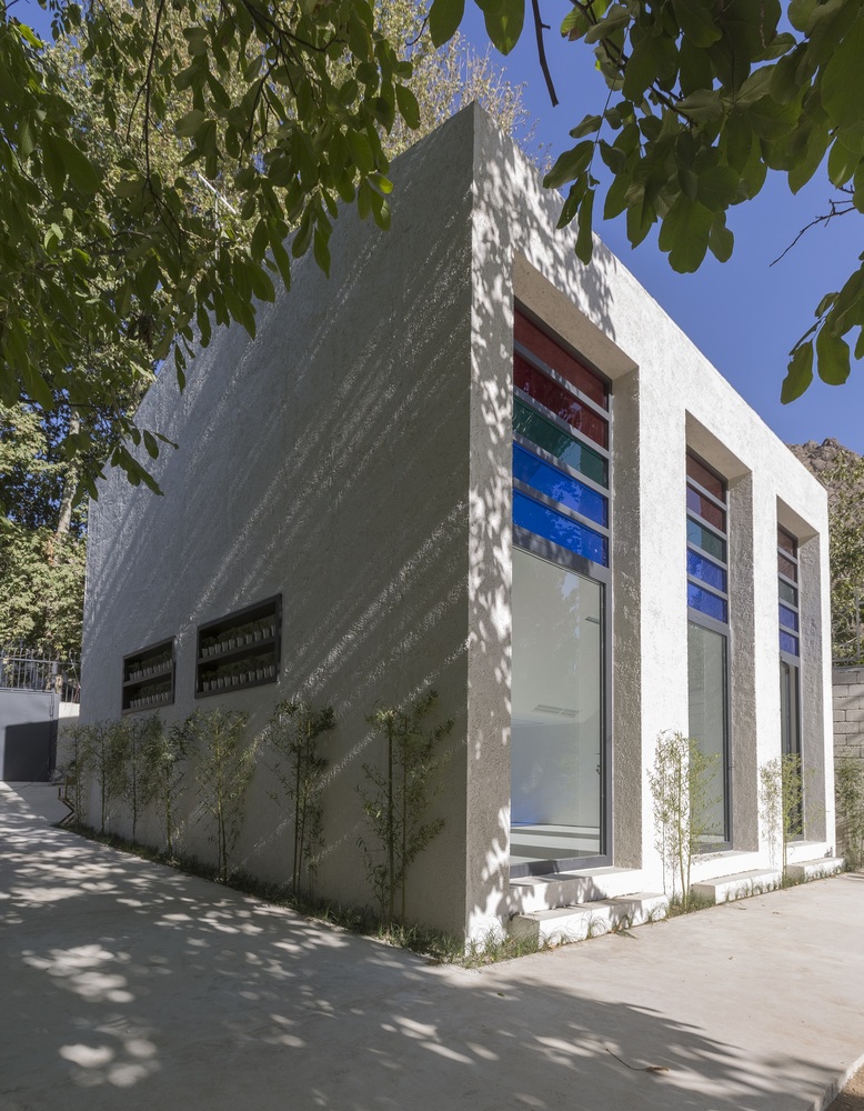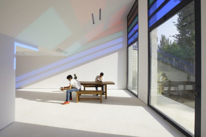 Ovo poslednje postignuto je tako što su na prozore dodati stakleni paneli u tri boje koji prave toplu atmosferu kada kroz njih prođu sunčevi zraci. Pošto je prostor lišen detalja i pošto je on potpuno beo i minimalistički, ova pokretna koloritna šema spiritualno obogaćuje prostor, piše ArchDaily.