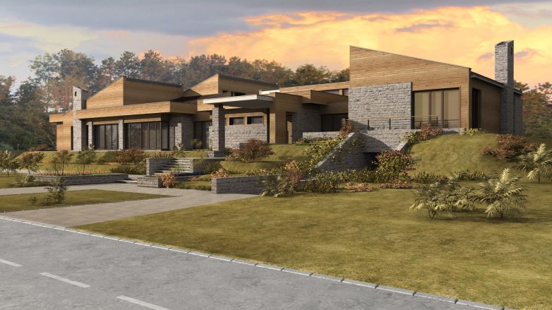 Fasade su pak oblikovane u nepravilnom (nesimetričnom) ritmu i u svemu pronalaze ravnotežu kroz primenu odgovarajućih materijala – kamen, drvo i staklo.
