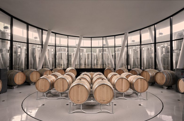 Čelični rezervoari su raspoređeni u koncentričnim krugovima, dok se u sredini nalazi prostor za starenje u drvenim buradima.