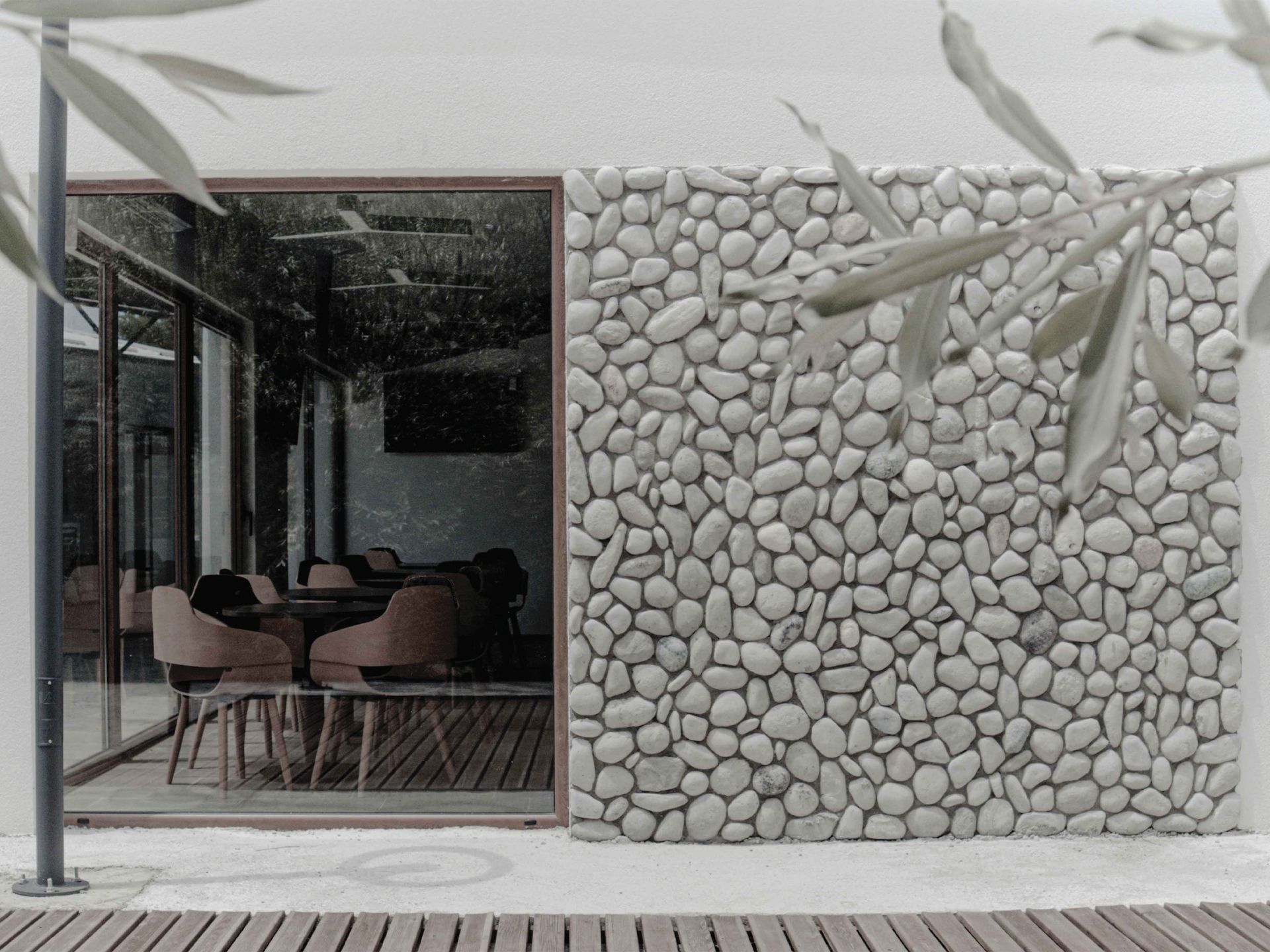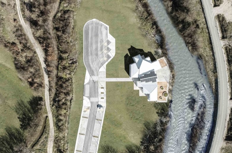 Površine su obložene lokalnim kamenom iz reke Bistrice na čijoj obali je podignut ovaj objekat od čelične konstrukcije i sa solarnim panelima na krovu.